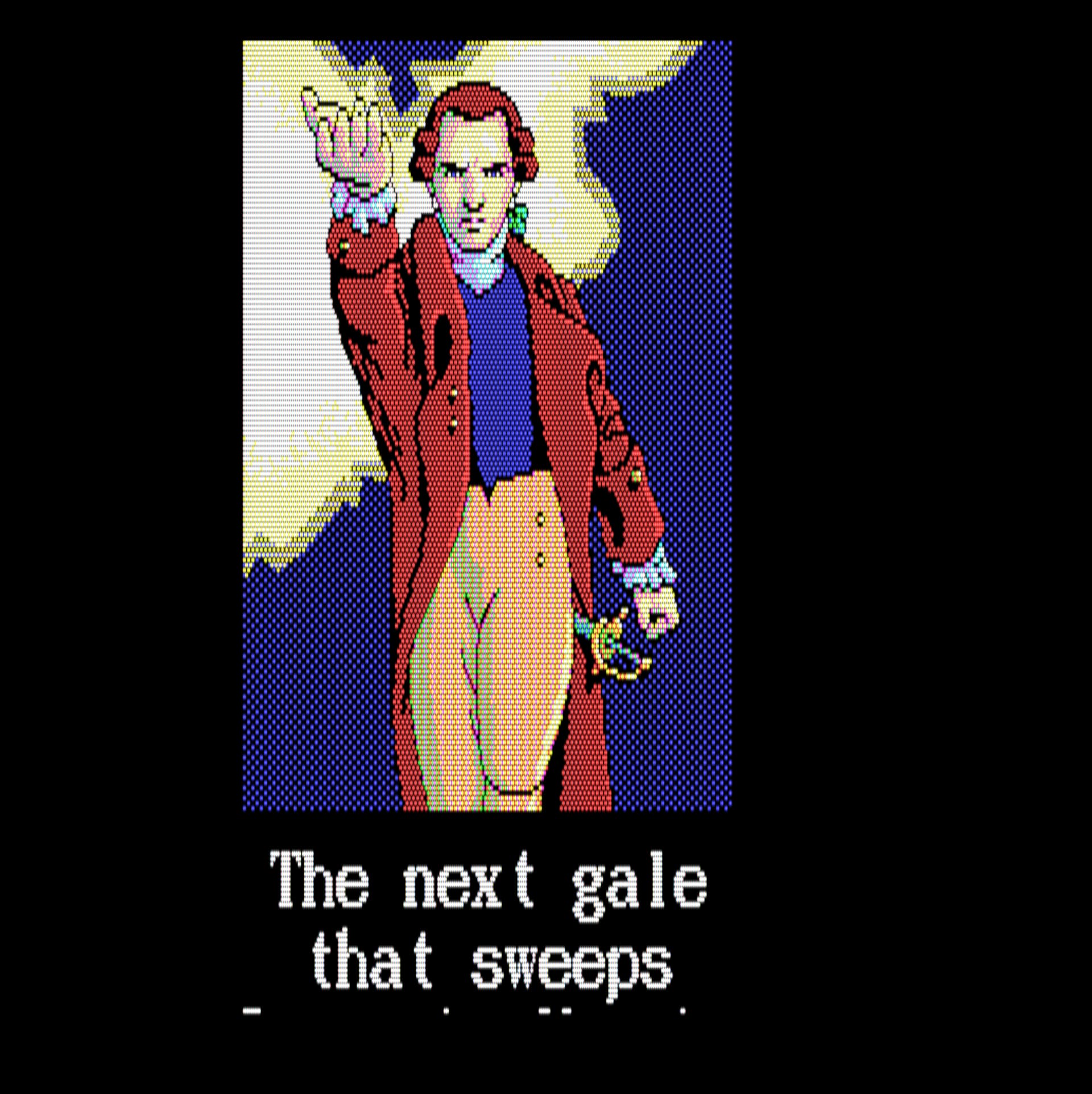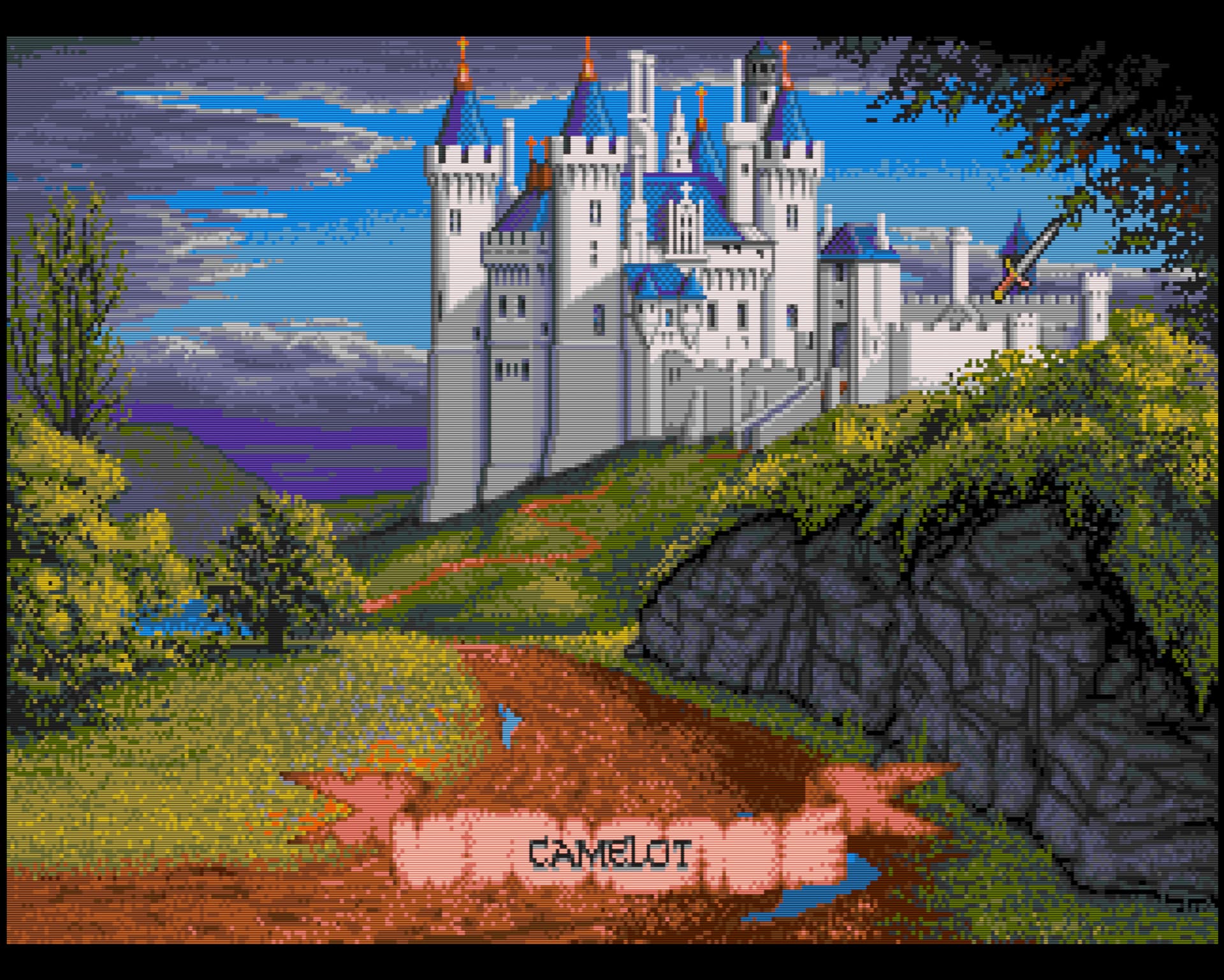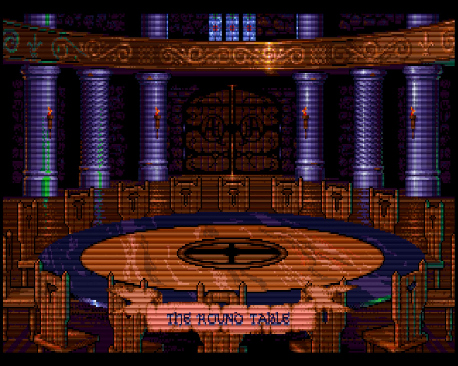 Story screen from FM-Towns version of Dragons of Flame (https://youtu.be/lpTk-N0-lTg?t=58), with characters and foreground from the Dungeons & Dragons module B8 “Journey to The Rock” cover by Larry Elmore: