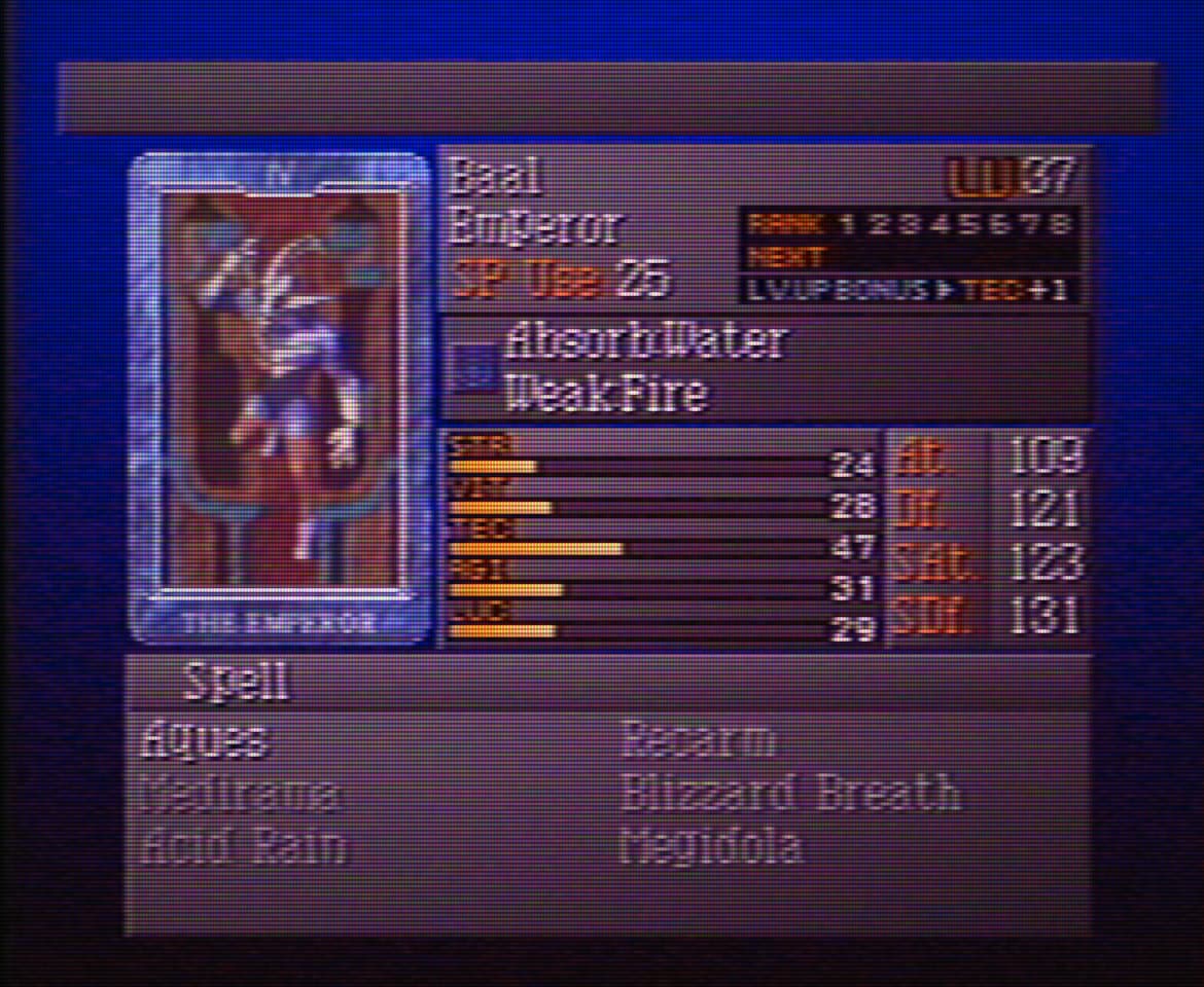 Yeah, by the time I got another Persona to replace Hel with, it was like, well, should I even bother? Considering Hel’s stats are pumped like crazy and it has Wind, Water, Earth, Ice, Fire, Nuclear, and Death coverage anything I replace it with is probably going to be not as useful or as strong for a while. Baal is like, 15 levels higher and most of its stats are half of what Hel’s are after all of the Perimeter Up mutations.
