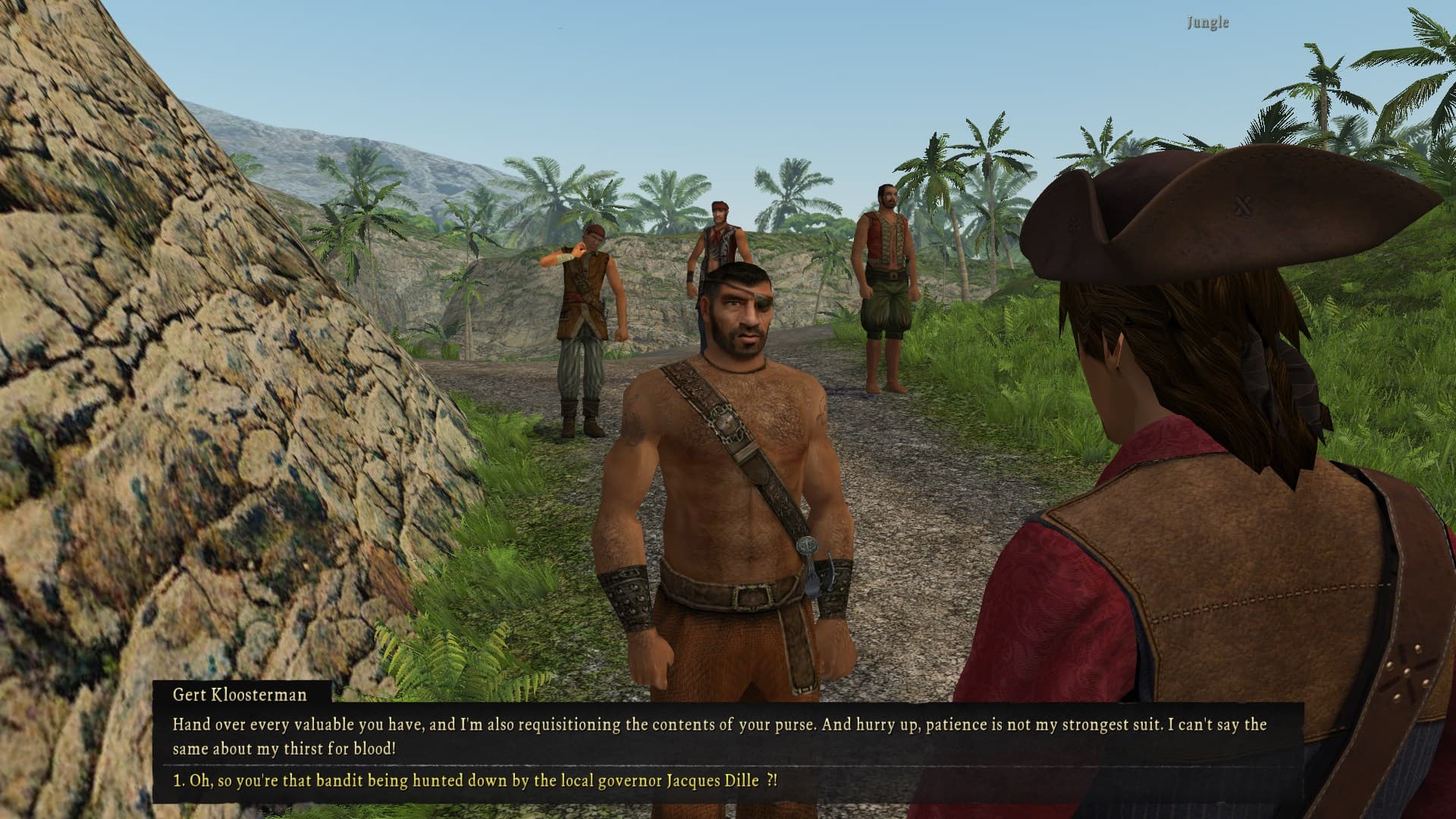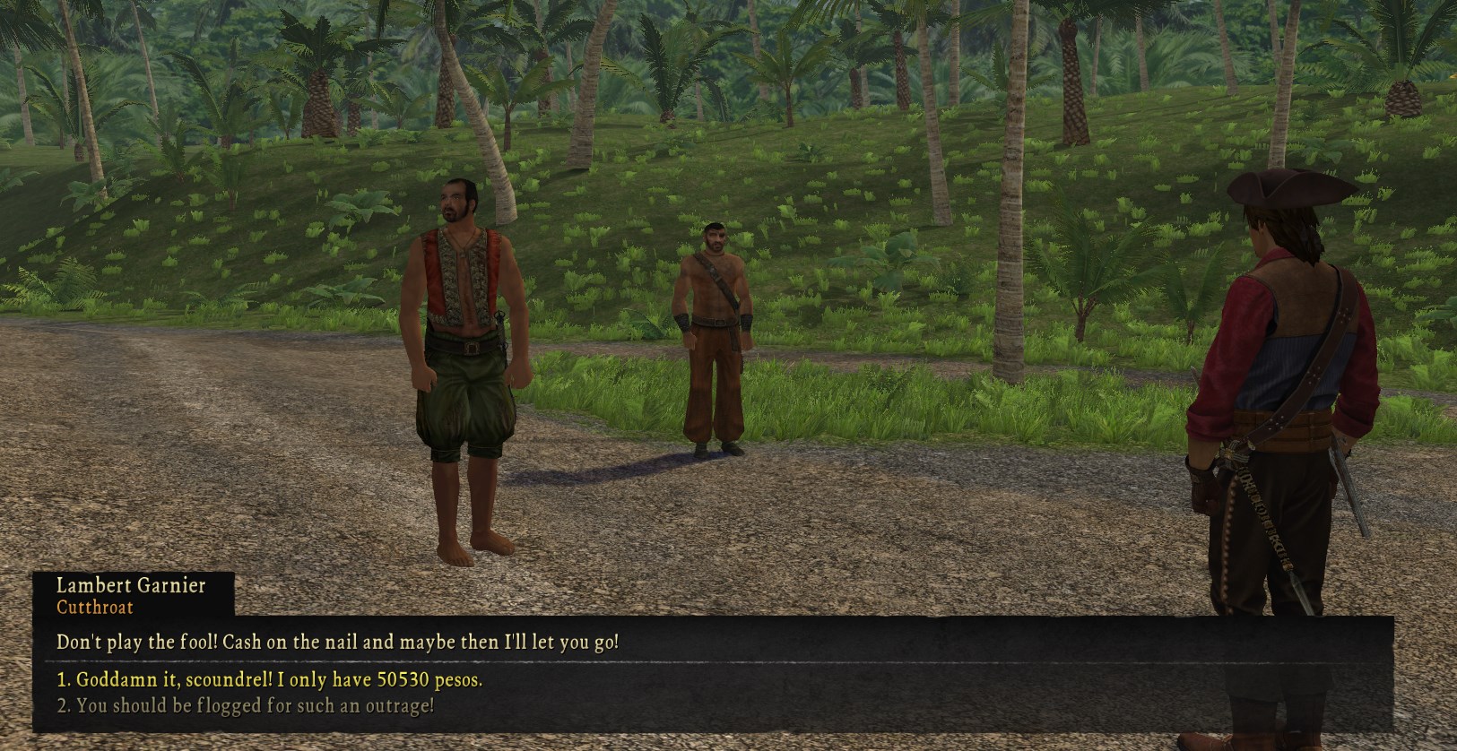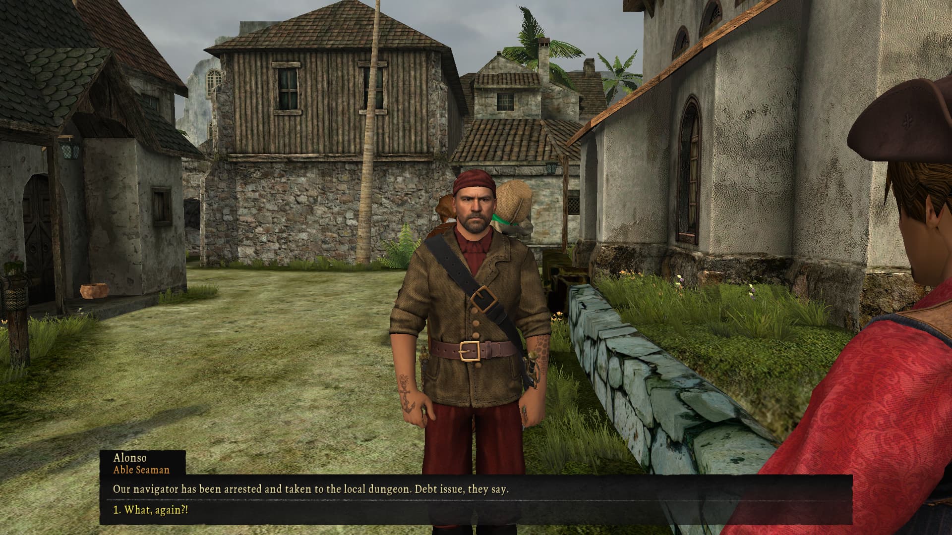 you end up having to do another favor/fetch quest for the money lender if you don’t wanna straight up pay for the navigator’s freedom from debt slavery, which requires you to intercept a spanish prisoner being spirited away in the jungle by some thugs and is the first fight in the game where you gotta take two guys. more wordy ass dialogue by the way