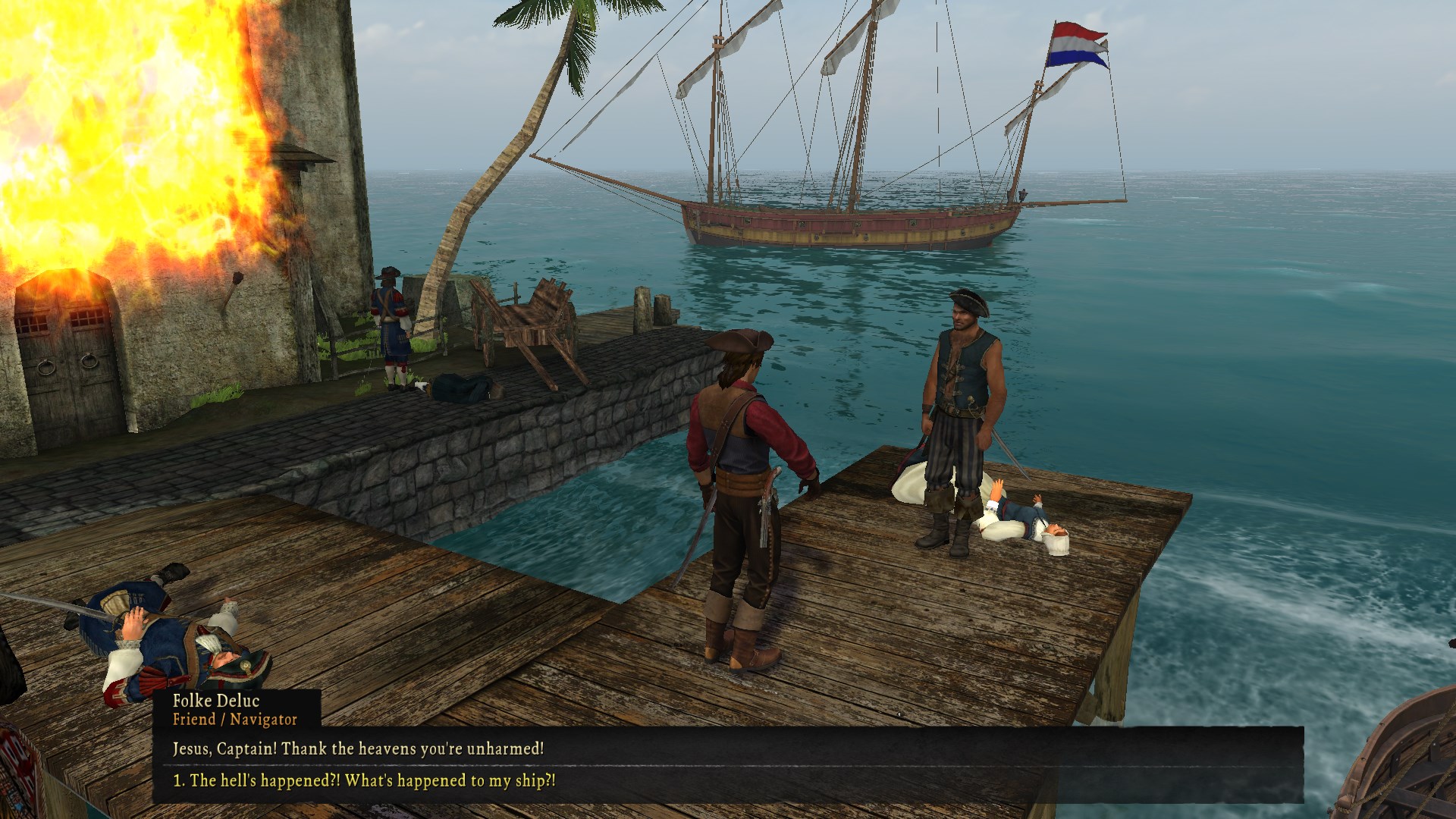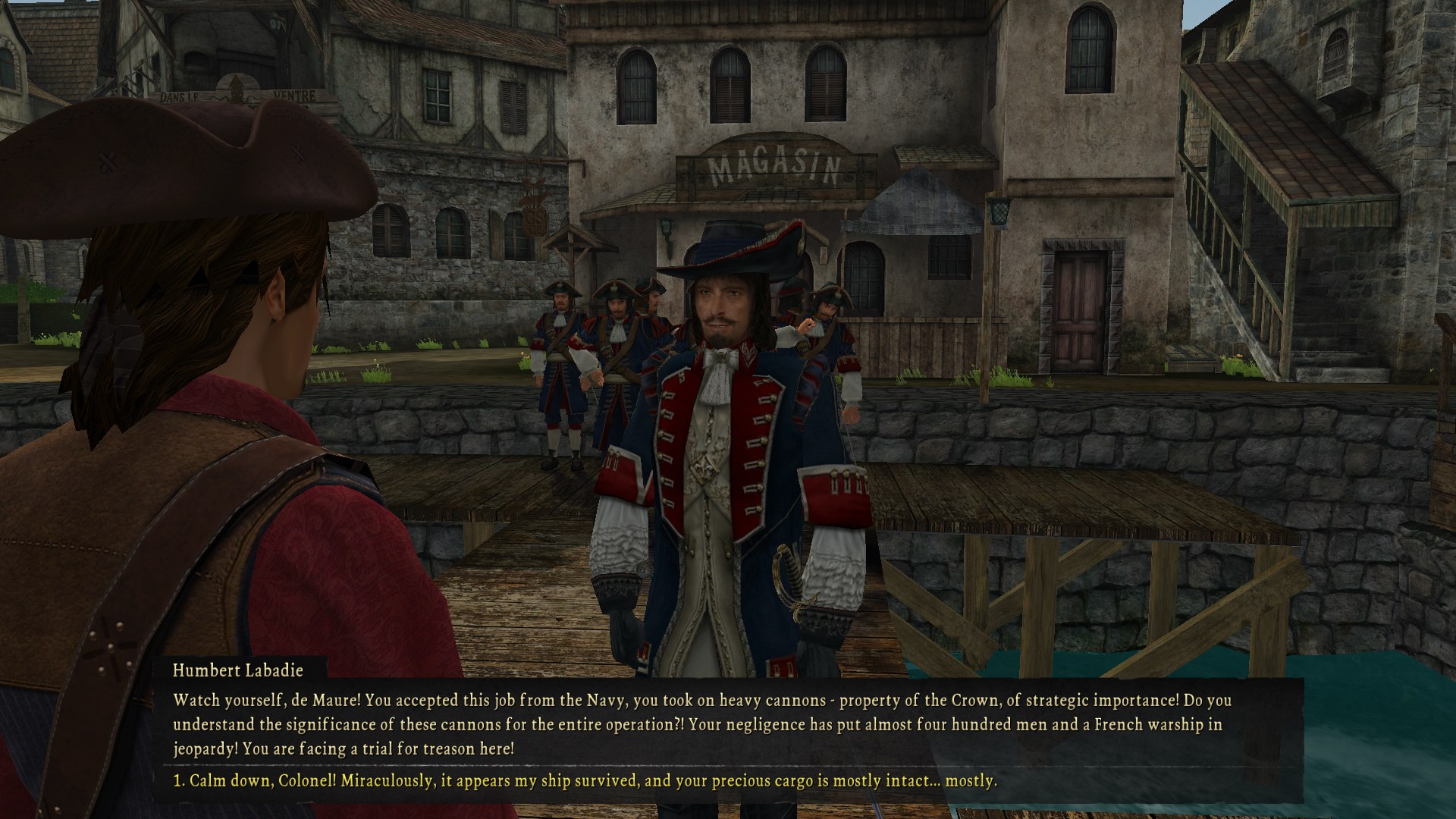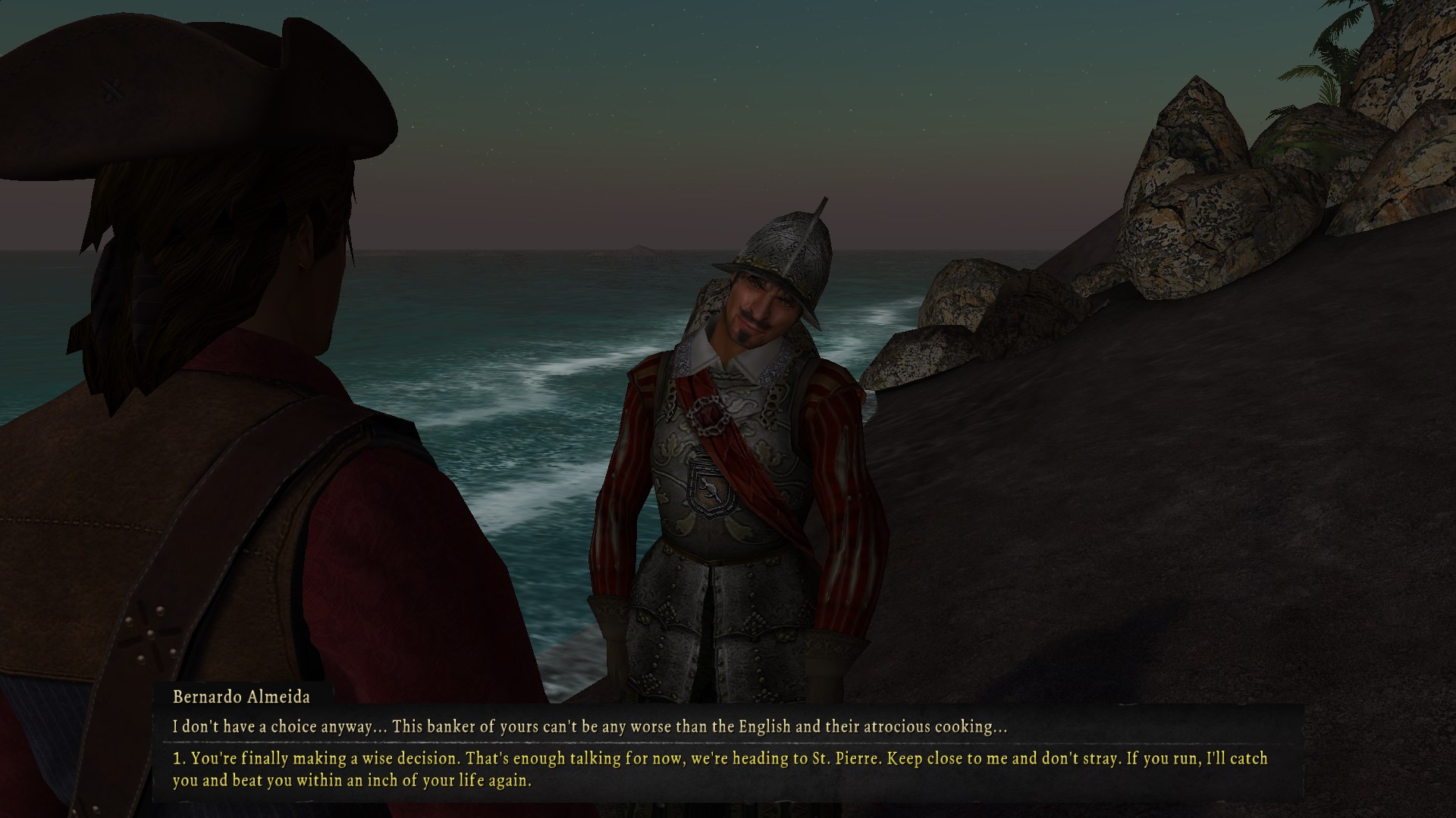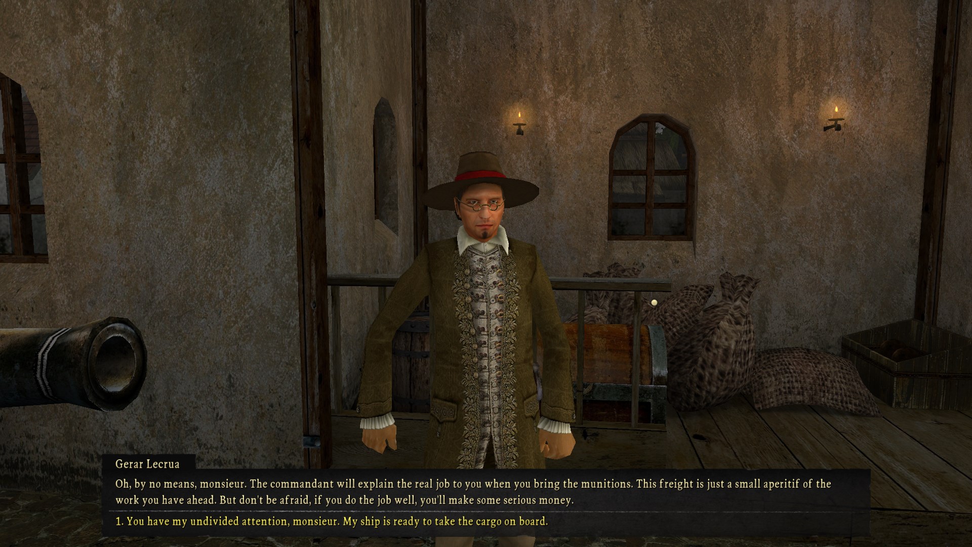 ok, so this is where you get to st pierre and all the stuff with the governor etc. the game has an even more extended tutorial here where you do a bunch of quests back to back basically. you loot every fucking bulding in town and find a bunch of secret notes that lead you to a stash. marcel tells you that he was doing wetwork for the french government or some bullshit and it went bad so now the governor-general of the french colonies wants 1,000,000 pesos. this is where they have their lengthy bitchy conversation at each other and basically marcel negs you into helping him out thru familial obligations and by going “well if I was free I could do it in 6 months you loser asshole dipshit” which naturally means we have to prove him wrong. furthermore he has a lugger he put a down payment on that we can use to sail around but we gotta get like 10k or 15k more, I can’t remember, you actually need like at least 30k to get off this island properly with supplies and whatnot but he sure as fuck don’t tell you that one. thanks marcel. he also tells us to go talk to this guy named fadey who talks like sidor from stalker once we can sail to Guadaloupe.