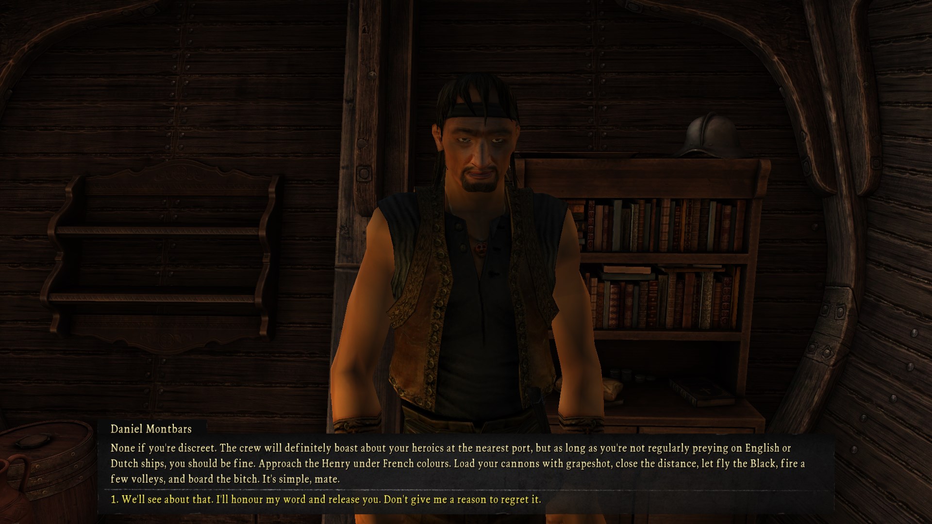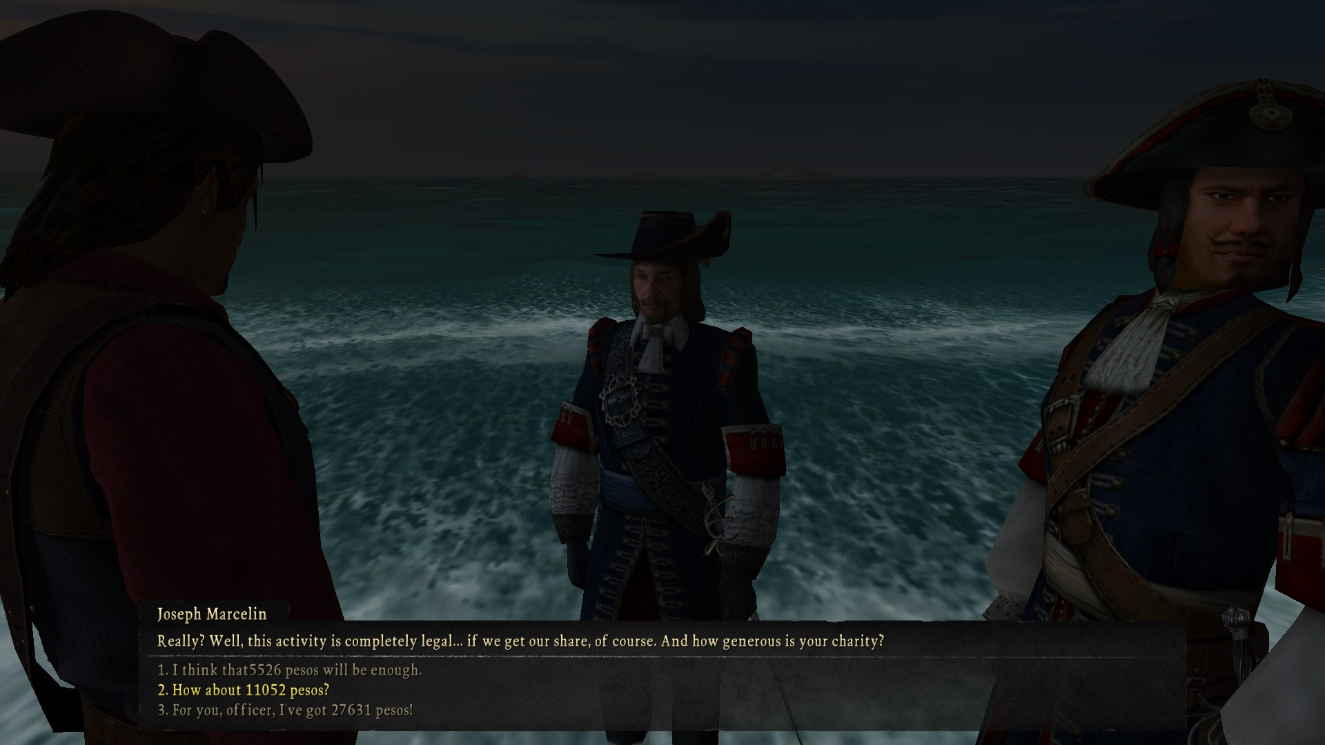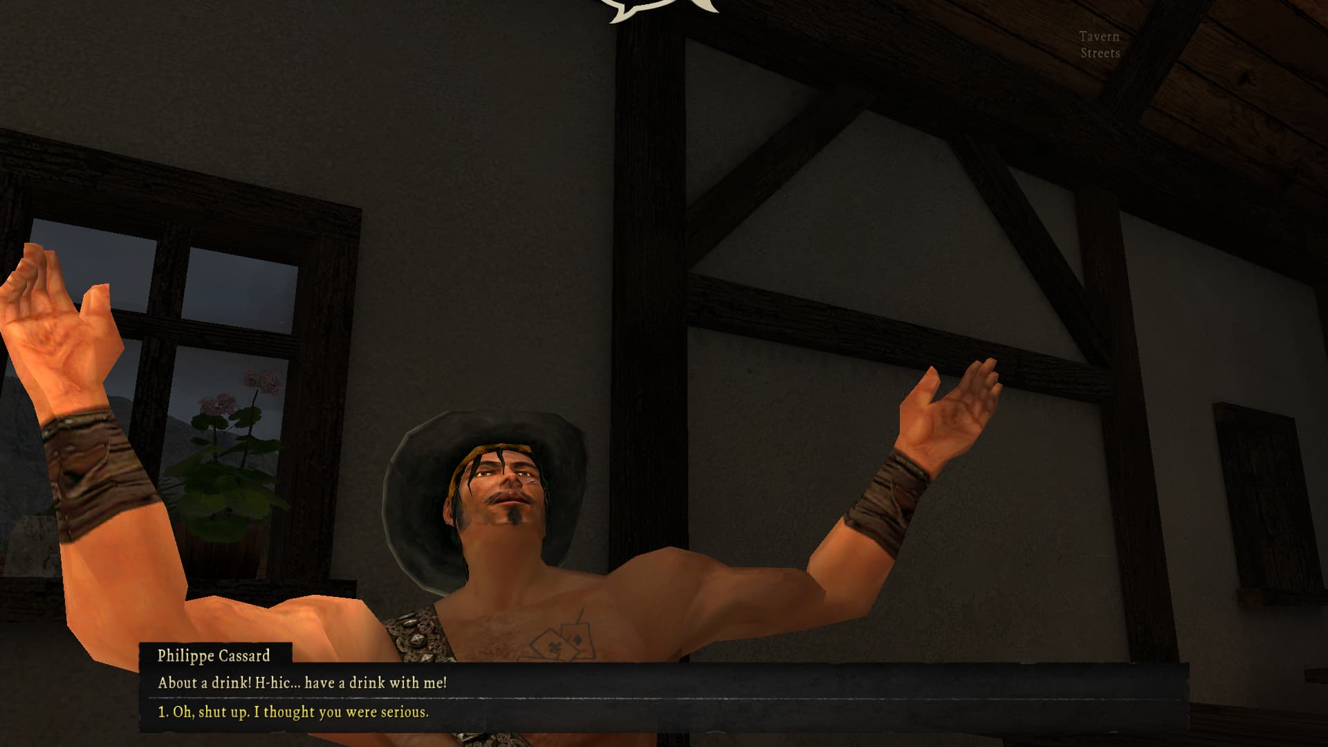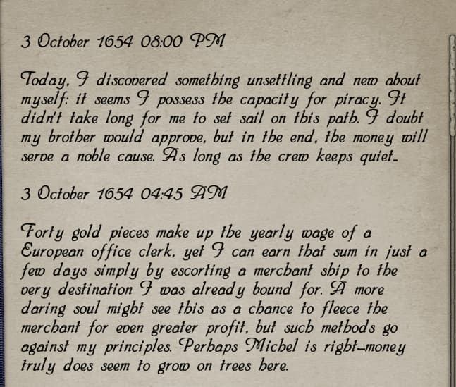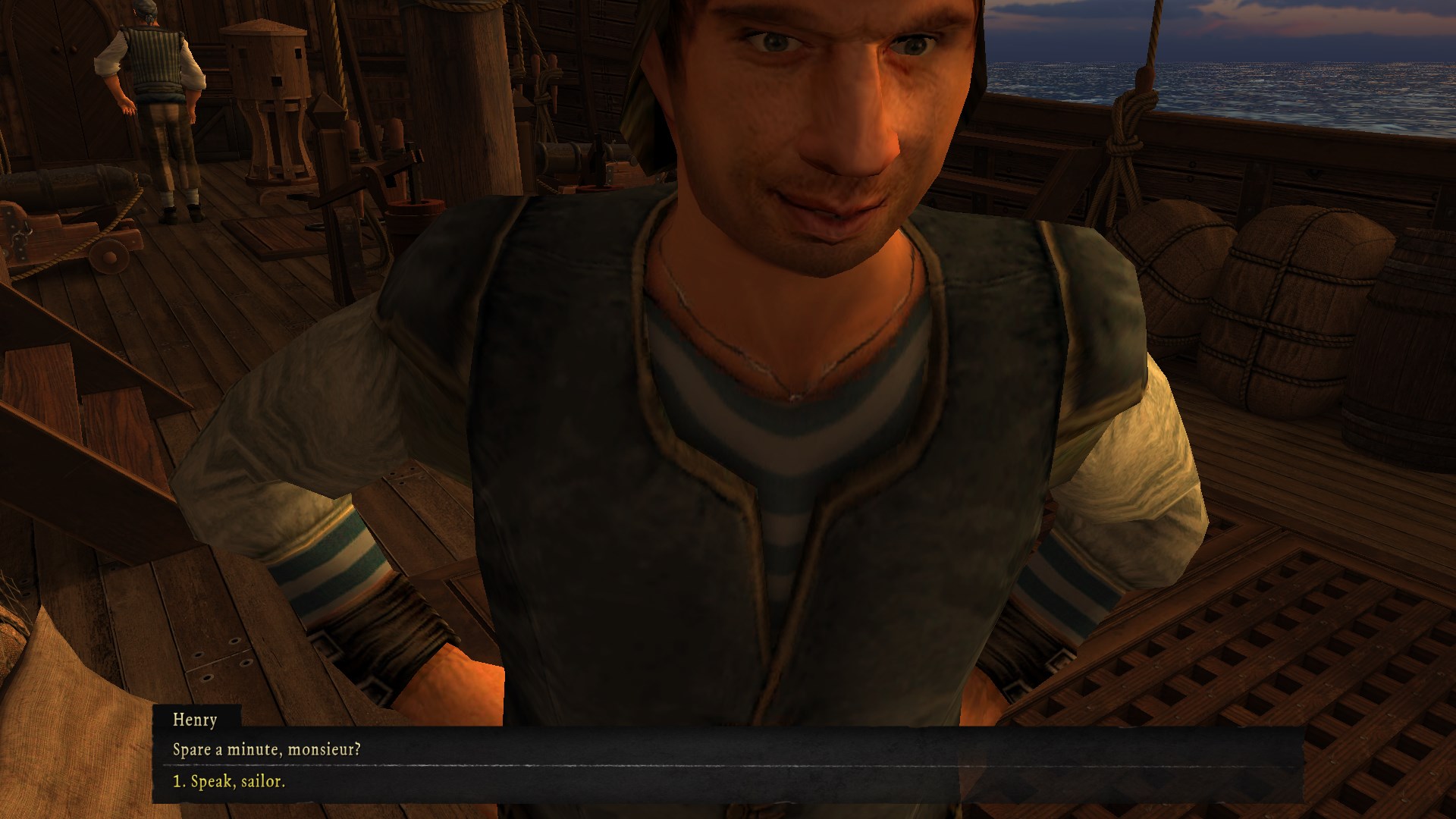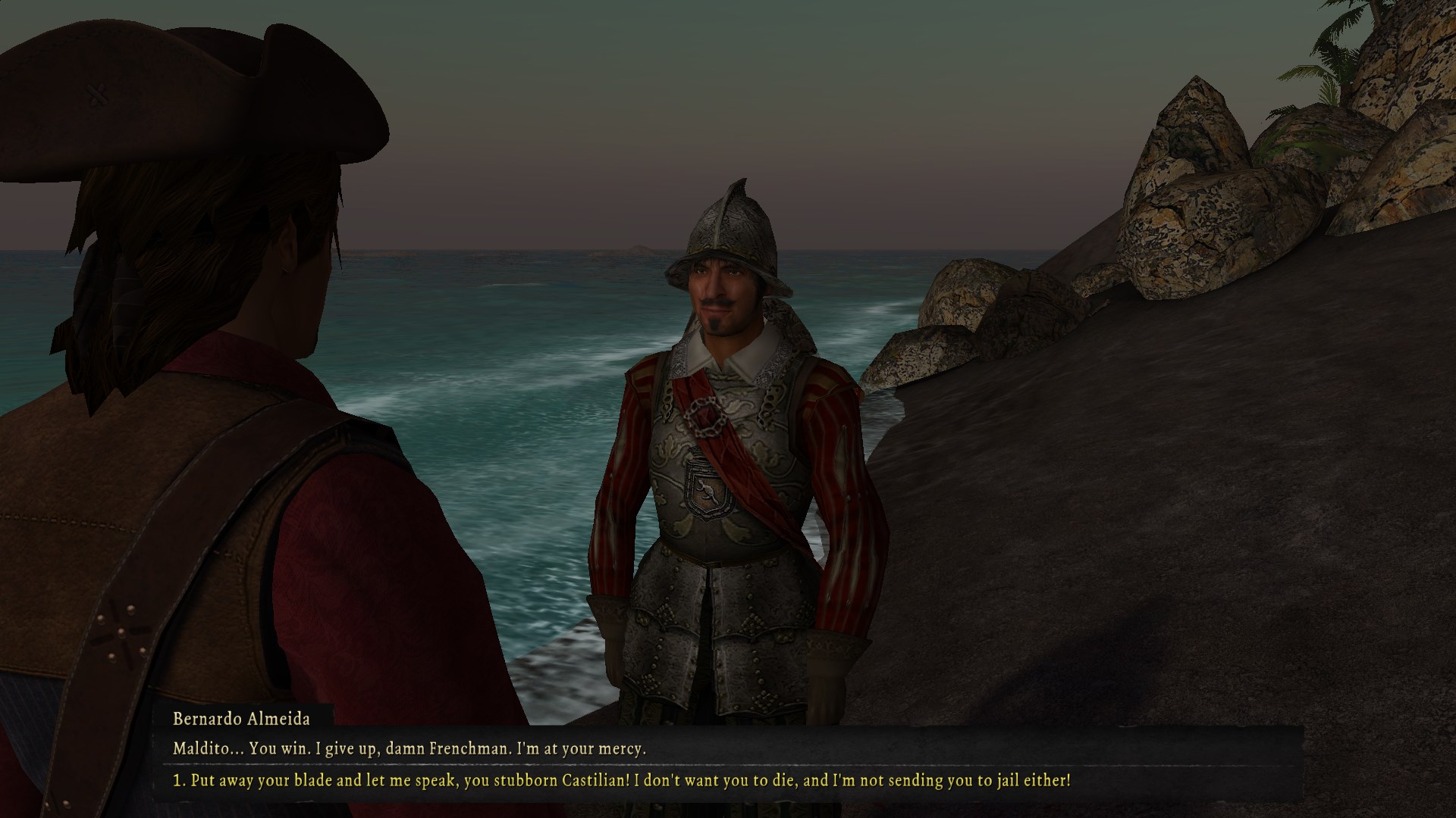 a great example of this high level awareness is the purser sidequest. in the prologue you can get access to 150 doubloons, which you have to trade jewels to the moneylender later on to keep getting. their purpose is to pay the sailors their wages for a sidequest, which you can simply not do if you know that the prologue is going to end in an incredibly bloody massacre where the purser dies and you can just keep the shit. in another game perhaps this would be normal rpg decision making but the scripted nature of many sea dogs quests means it’s impossible to tell if these kinds of alternate “solutions” are regularly available.