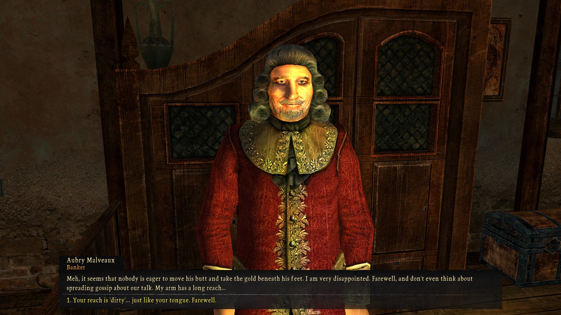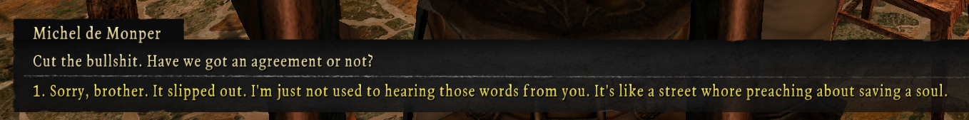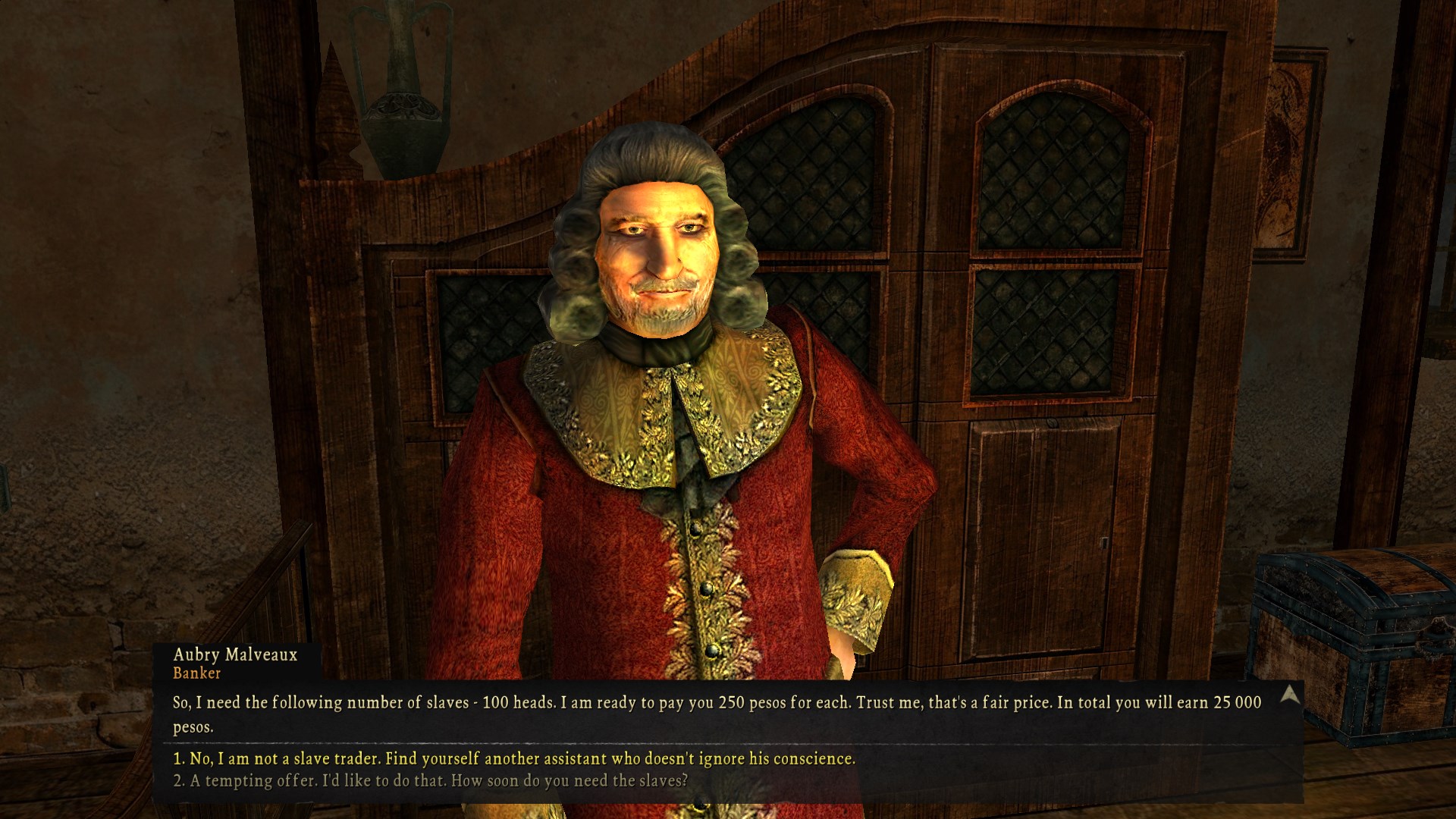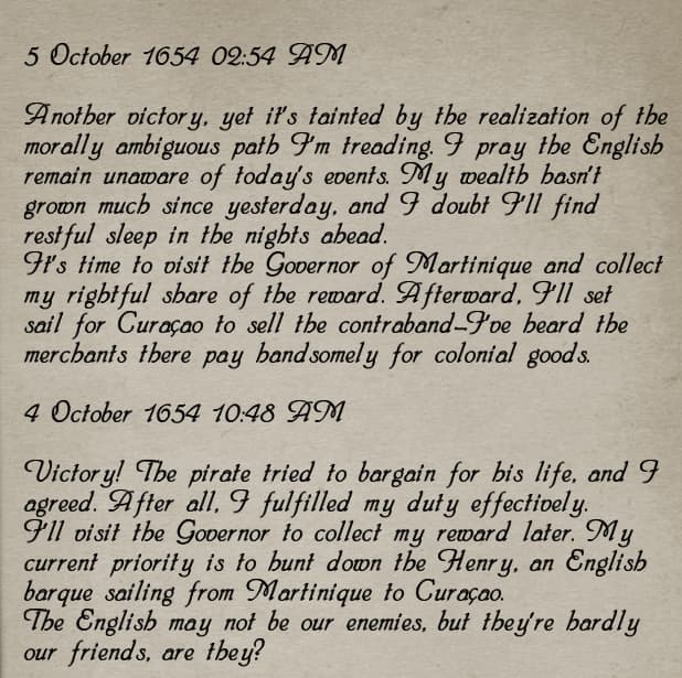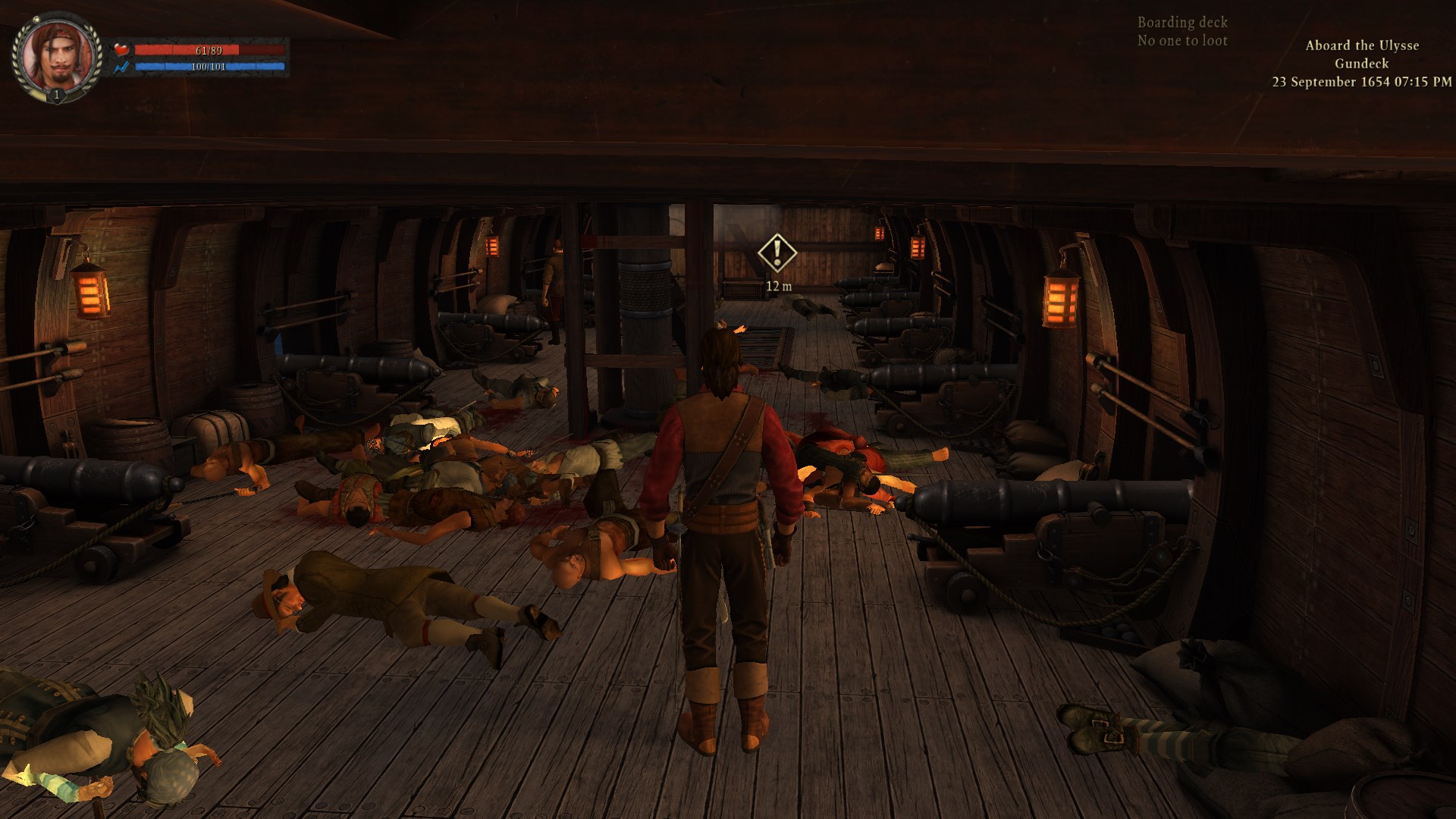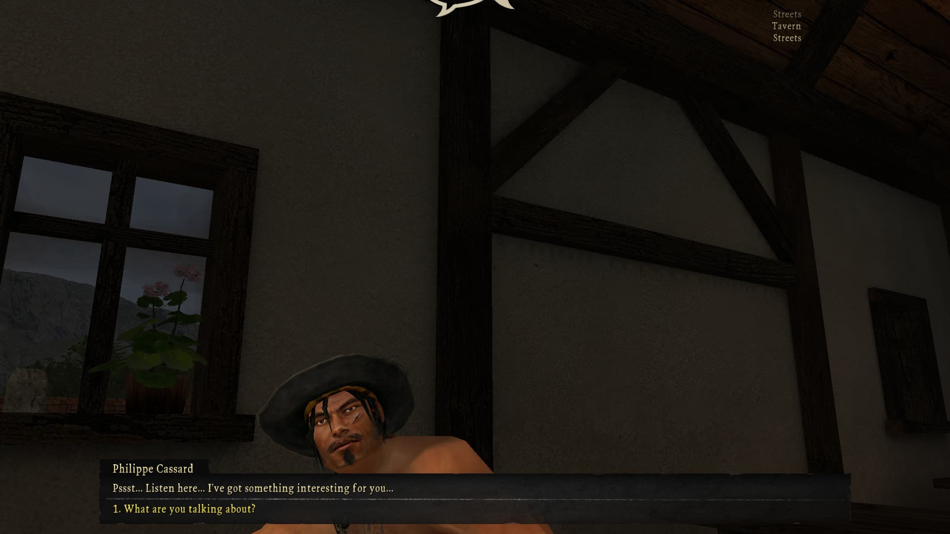 a great example of this high level awareness is the purser sidequest. in the prologue you can get access to 150 doubloons, which you have to trade jewels to the moneylender later on to keep getting. their purpose is to pay the sailors their wages for a sidequest, which you can simply not do if you know that the prologue is going to end in an incredibly bloody massacre where the purser dies and you can just keep the shit. in another game perhaps this would be normal rpg decision making but the scripted nature of many sea dogs quests means it’s impossible to tell if these kinds of alternate “solutions” are regularly available.