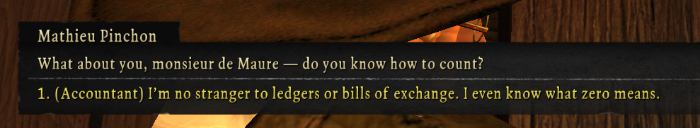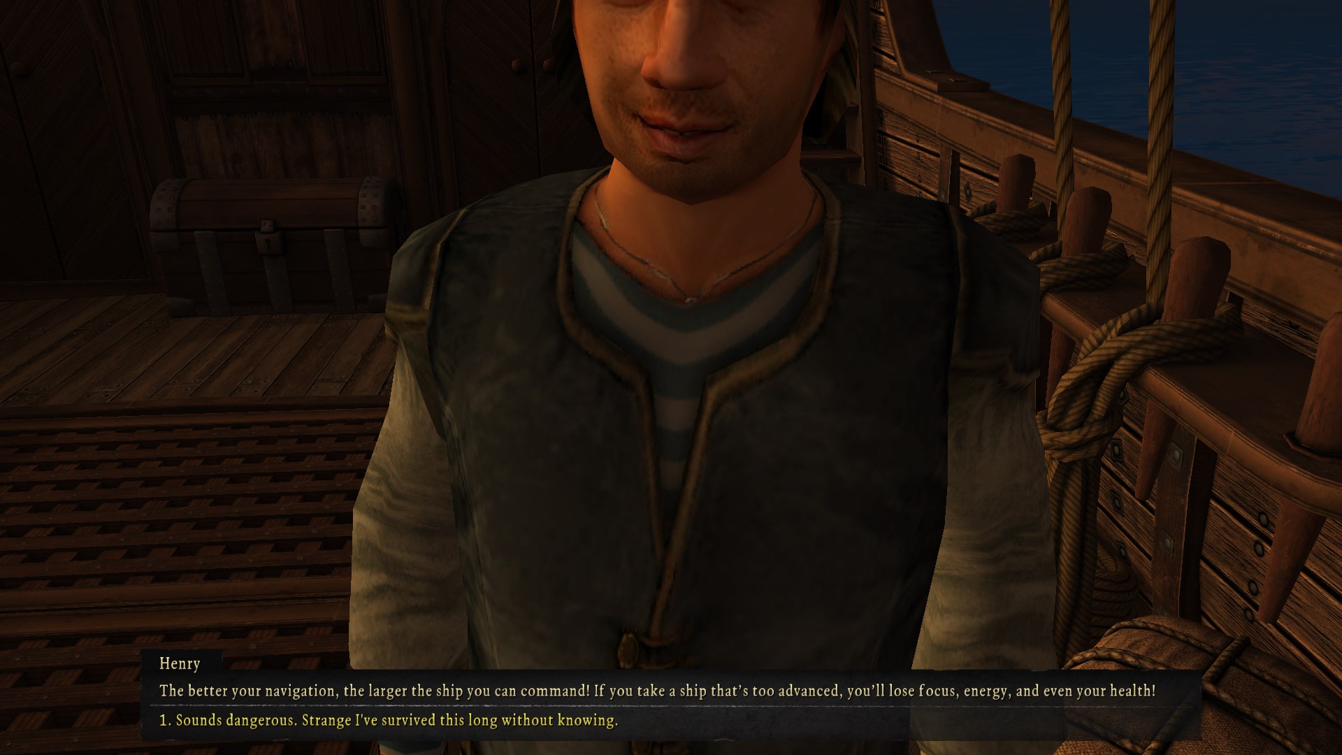 there’s a guy in the hold you can talk to and if you don’t kick the windlass you won’t have a high enough navigation skill to answer his question, which means you don’t get a fairly valuable item that increases all your skills by +2 whenever it’s equipped. good luck knowing that! the game in general seems to reward you having extra sensory perception of what’s going to happen next, like attentiveness wasn’t enough, the player needs to achieve a higher state of consciousness to accurately predict their way through the dialogue trees in this game which get extraordinarily lengthy