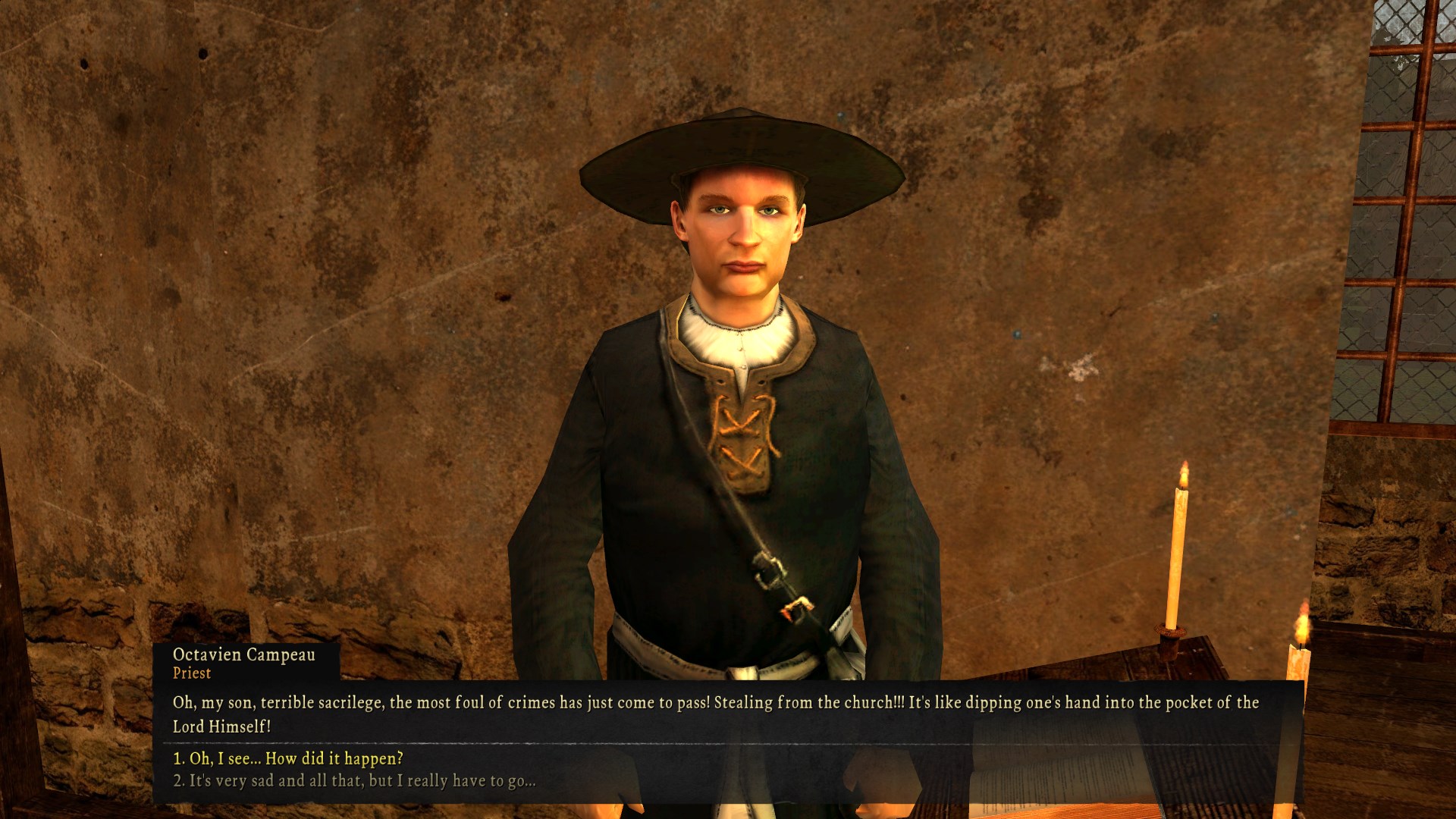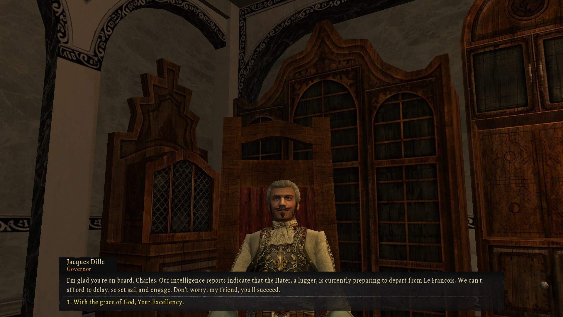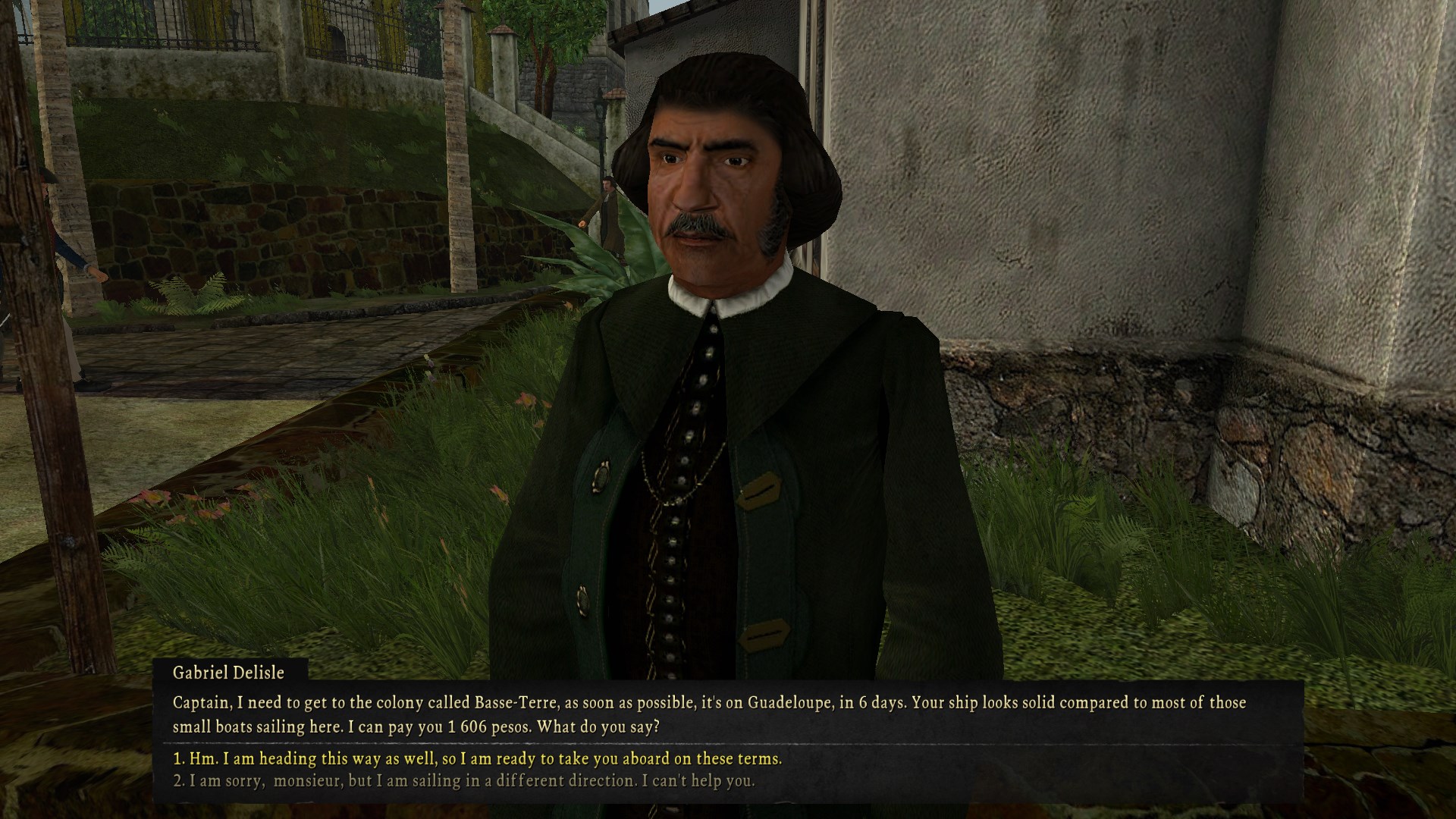 so sea dogs is mostly about staving off unattentiveness as much as possible. there are 40 fucking million ways to drop the bag in this game and half the time you won’t even realize you did it at first. pick the wrong dialogue option in the tutorial and skip learning how to do a bunch of stuff plus loot, skill increases, and xp. when you get off the dock in st. pierre your goal is to ask around about your brother, and if you’ve bothered to actually read the lengthy letters in your character’s inventory at the start you may start to understand that he’s in serious trouble. besides a very specific townsperson you might be lucky enough to see immediately from the dock, pretty much everyone else tells you to ask the governor which leads to you getting all your shit taken and thrown in jail. and you don’t get any of it back, just replacement items. this is probably the first moment I could see a new player falling victim to sea dogs. just outside town you can very easily fuck up the quest that gives you THE WORLD MAP IN A SAILING GAME because the right thing to do is talk to the governor, who quite possibly just fucked you over incredibly hard in the first 5 mins of the real game. what you’re supposed to do is go talk to the abbot at the church after a particular wandering townsperson tells you to, and then you can go meet with dear brother marcel without getting arrested and losing the treasure map you potentially scraped 6k pesos together for in the prologue by being attentive which i’m gonna go back to for a second because the hour i spent there is where i learned to love sea dogs