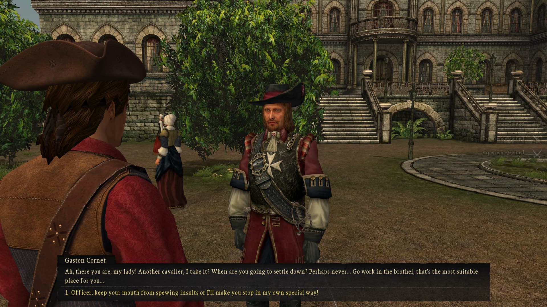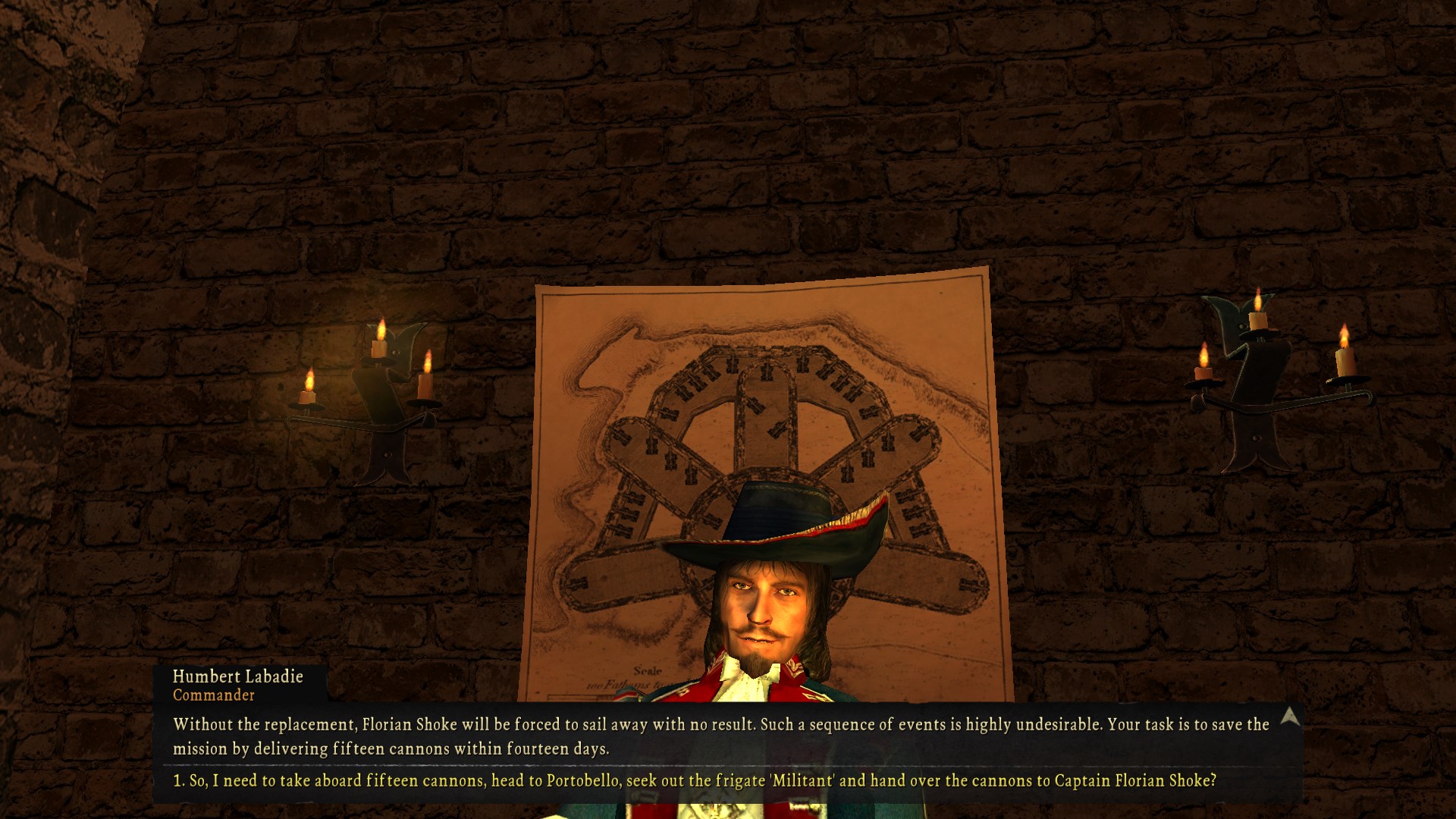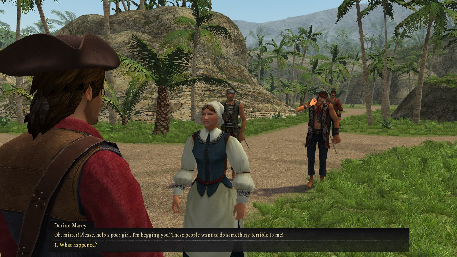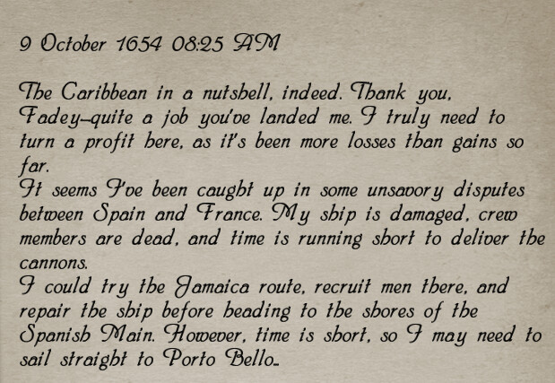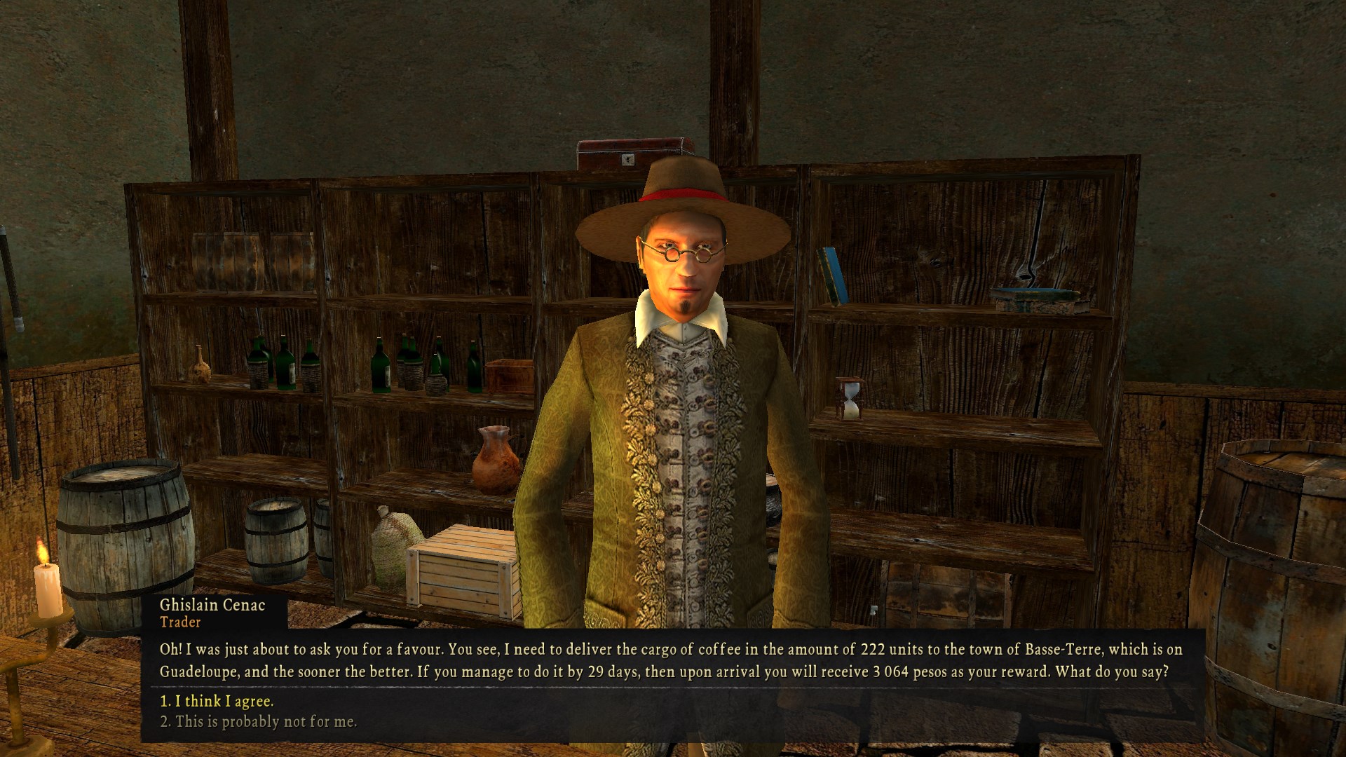 you come back, escort the girl to the guy’s house, and at this point my goal was to get some more money to cover provisions and crew, so I found some guy at the nearby fort who wanted me to get him no less than 10 bottles of expensive european wine. i ended up having to talk to merchants and get an introduction to the illegal wine trade through a letter the fortune teller gave me but then I was able to buy the 30 bottles and return them to the soldier the next day, which doubled my money. at that point i was finally able to buy the lugger and harass the bartender until he told me where to find sailors and a navigator.