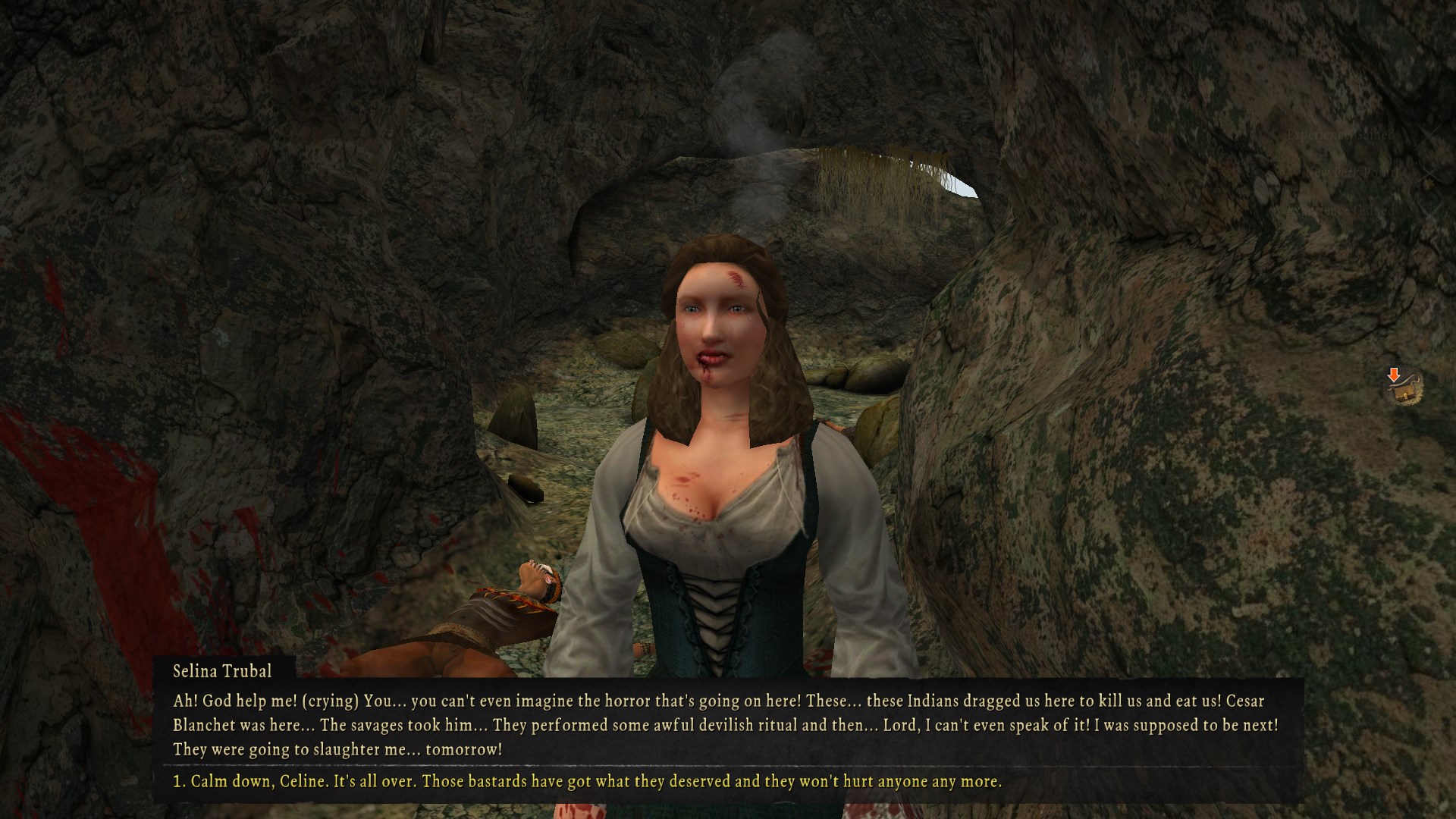 you raise the money by helping the shopkeeper find an assistant after his fucks off to the pirate town on the other side of the island, this of course requires you to pick the best worker which at least in my situation required a guess based on the weird personal reward each guy offers you. while you’re in the jungle this is where you find the governors wifes lost earrings on a dead guy but you have to figure that out by investigating on your own and the merchant offers an easy death option where you won’t get the world map, and it’s funny because it’s a worse much deal than if you got the map, copied it to your atlas and then sold it to the priest at the church. so you help this other guy who’s daughter’s been kidnapped by cannibals…and…yeah…this is some russia guy gaming unfortunately. every time you kill one of these guys it says “Indians disapprove.” in the top right of the screen which would be kinda funny if we weren’t getting blasted with the racism beam at the same fucking time