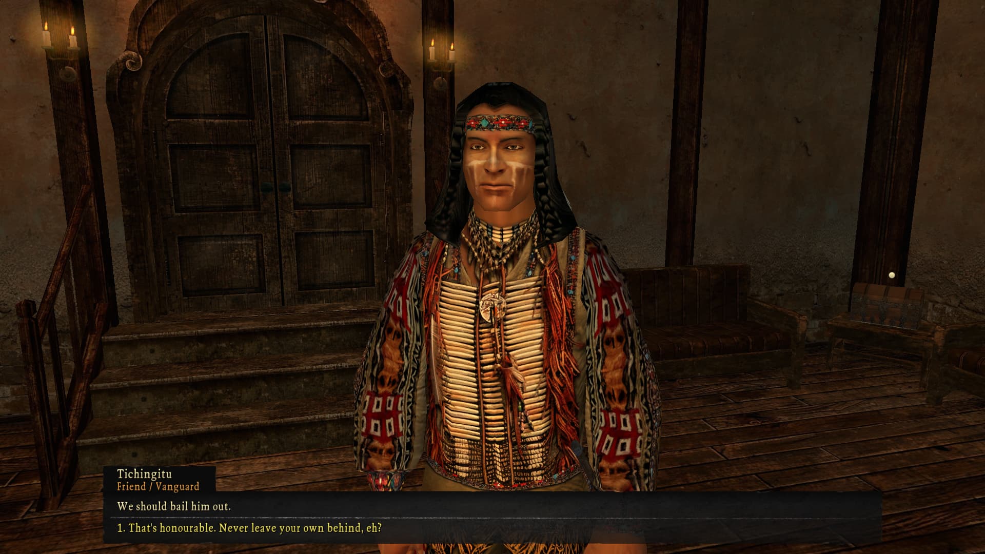 immediately after you get him out of the damp cells of club francois he starts going on and on in a…bad…dialogue about how he owes you a blood debt basically. yeah let’s go with that. so now Tichingitu is your sworn bodyguard, he uses muskets which naturally I have not found at all yet.