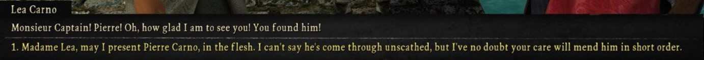 The final line is his wife talking, but I was unable to take a screenshot because I also saved a woman in the jungle at the same time and she ran up to me interrupting the dialogue which broke the entire cutscene and left me in permanent stasis, of course. So I had to reload a save and mash through the dialogue as fast as possible before she could reach the jetty. Luckily this class of NPC doesnât spawn directly next to you like the ships passengers do.