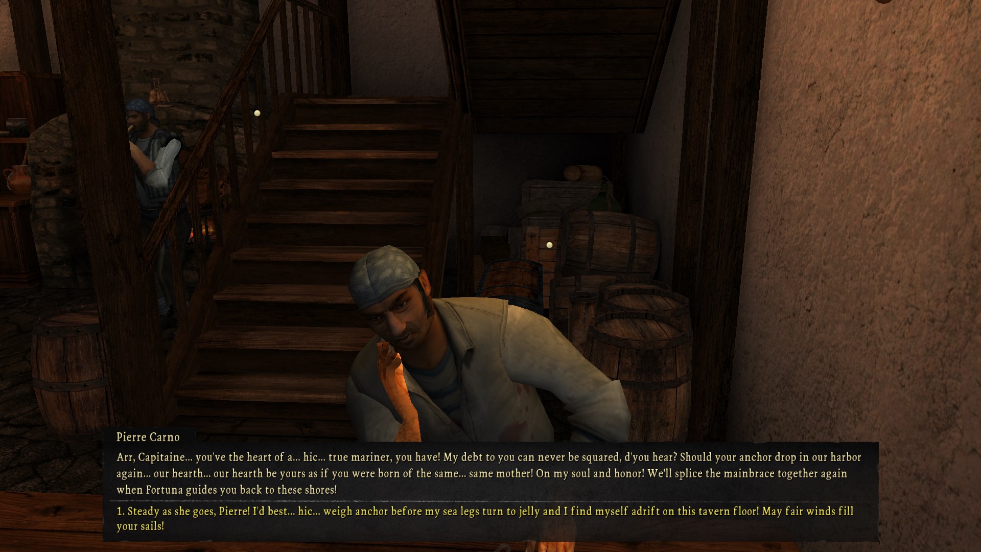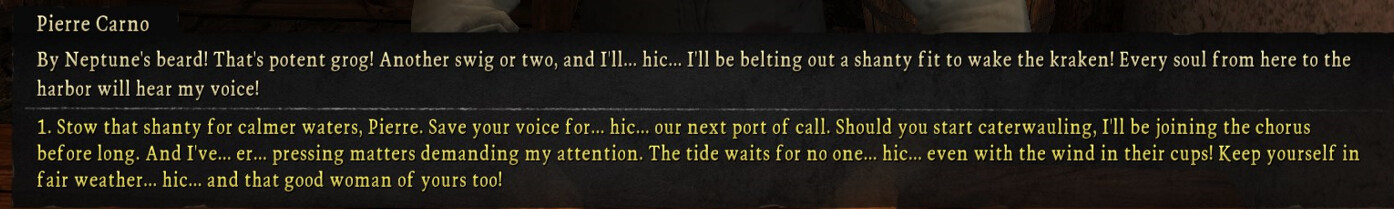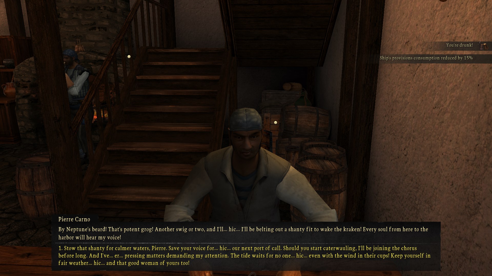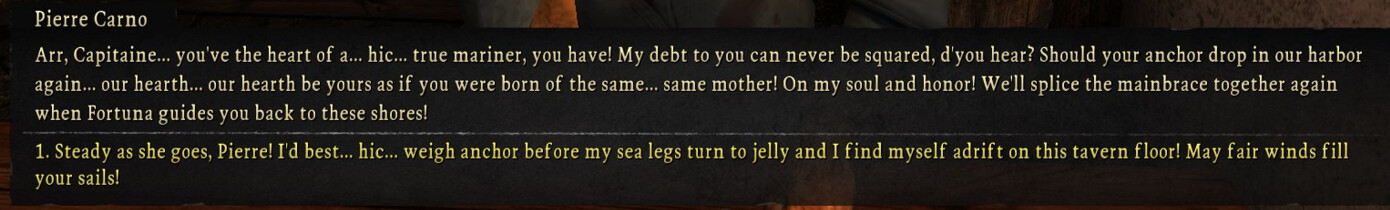 A few hours later we meet up with the fisherman at the bar and get totally fucked up on grog. If you deny his monetary rewards he teaches your crew how to fish so they permanently use 15% less provisions. There is a trend in this game where while money isnât cheap, you should really never accept it if you are ever given a choice of reward. Being generous and refusing peopleâs money almost always leads to more useful rewards.