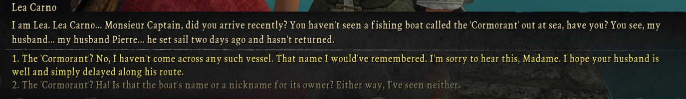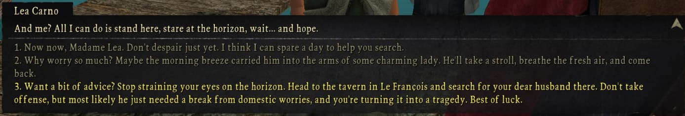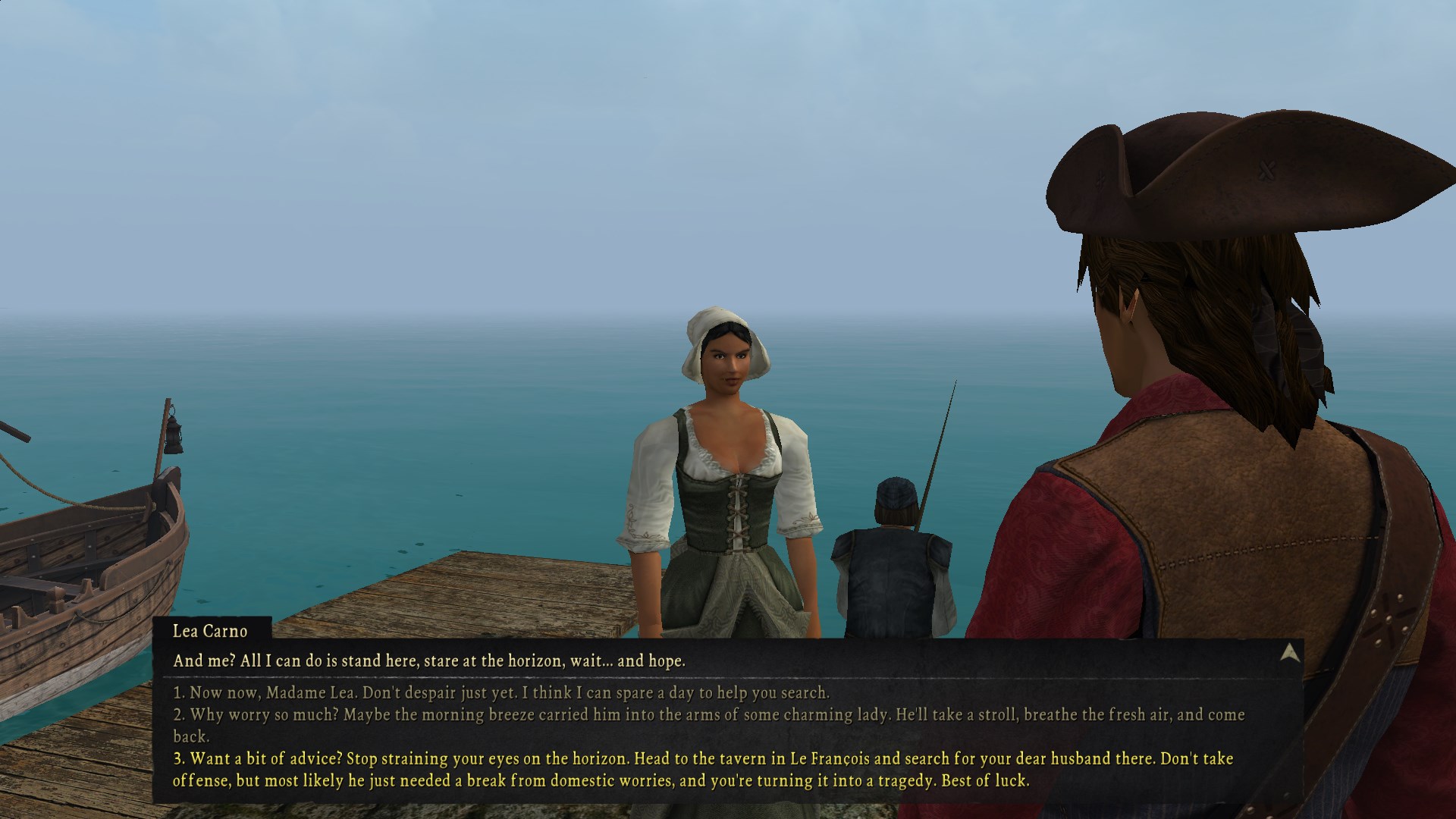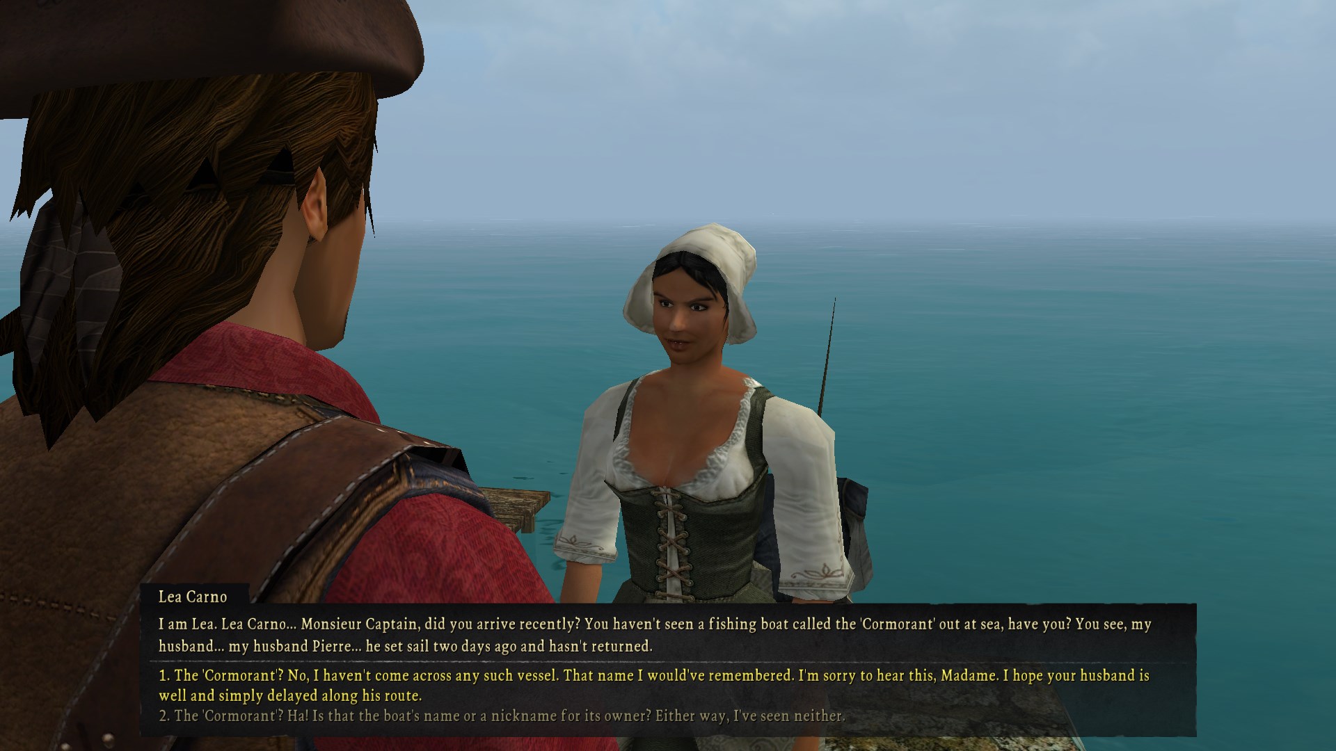 You meet a lady standing on the jetty who laments that her husband hasnât come back from his most recent fishing trip. Naturally you can tell her sheâs hysterical like most interactions with women in this game when they ask you to do something but as usual I refrain from engaging in the misogynies and agree to help.