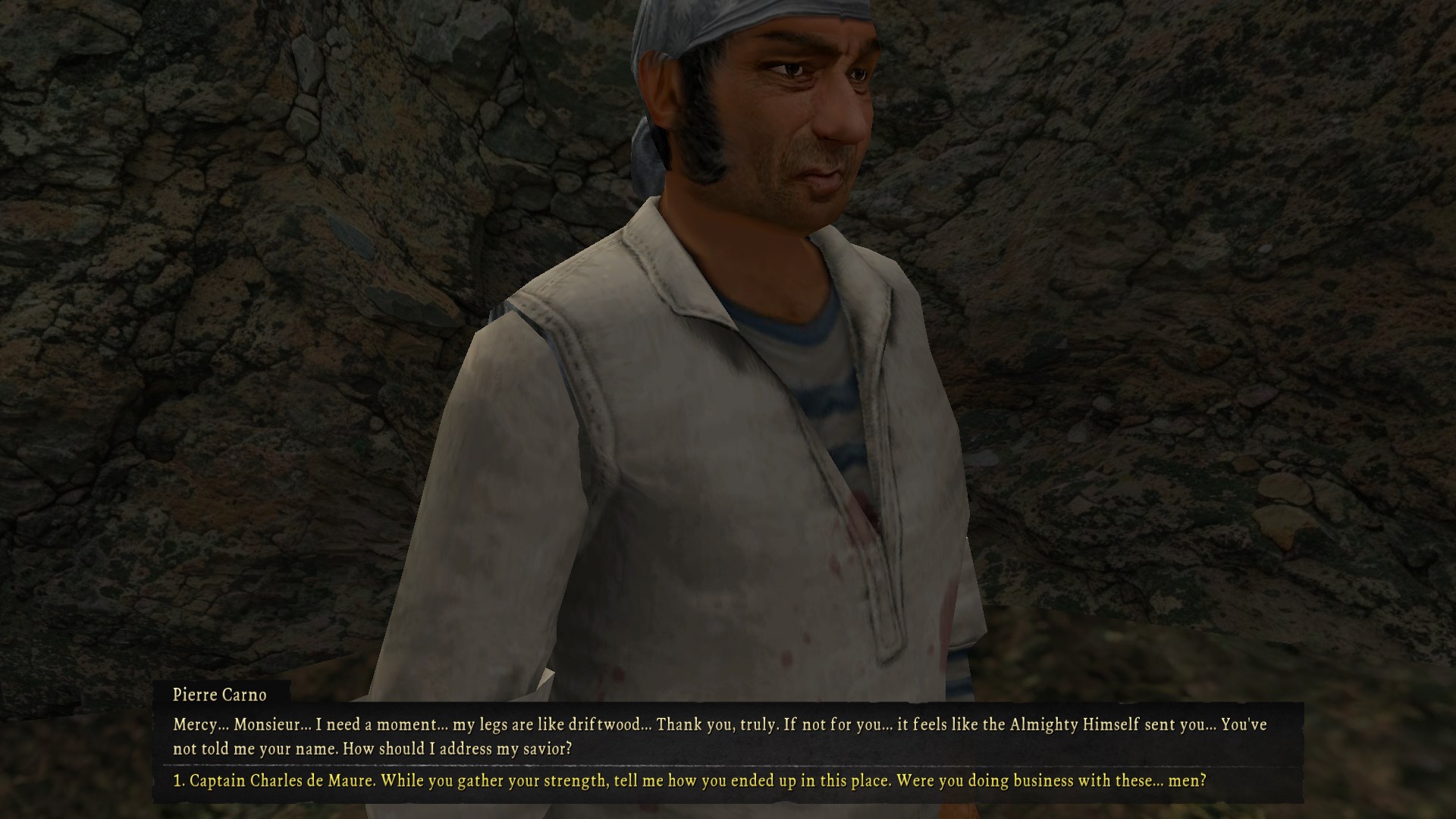 We head into the nearby cave and it turns out the fisherman has been held there for days. The bandits sunk his ship very easily and immediately took him into custody under the assumption he was one of the governorâs spies.