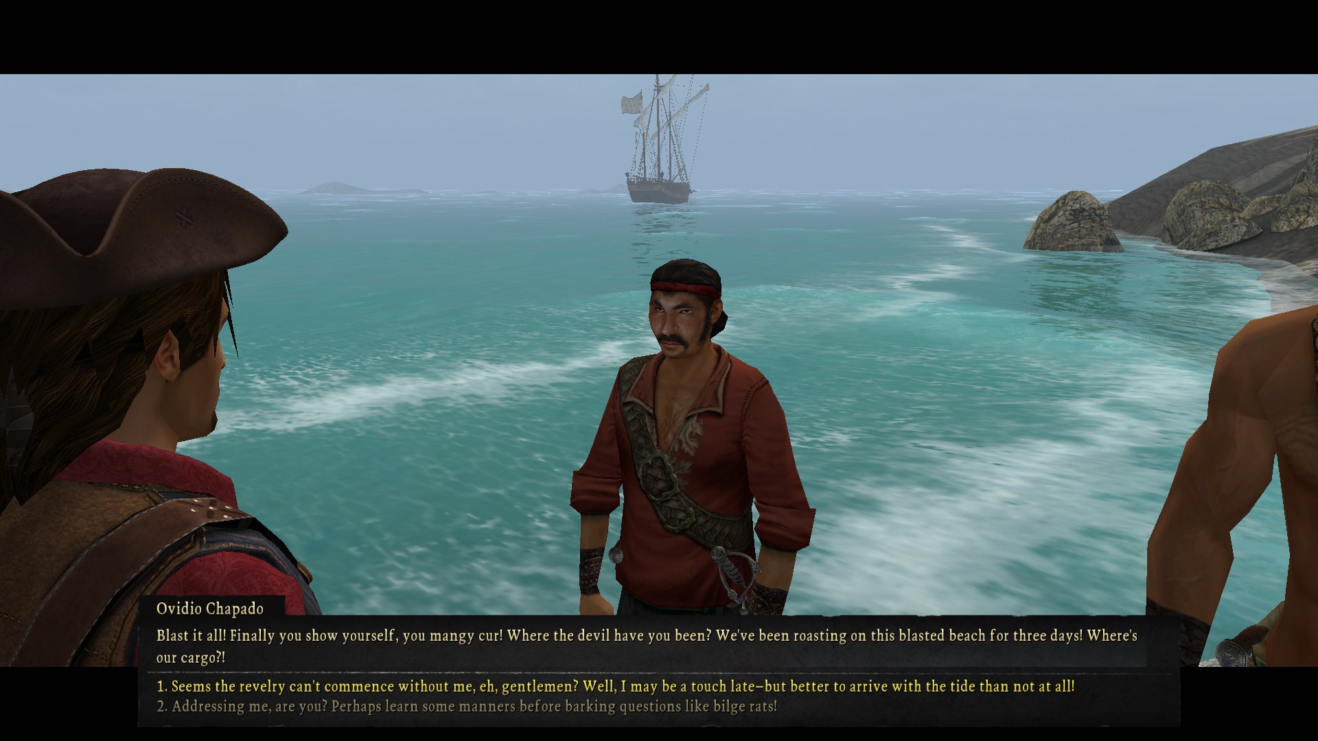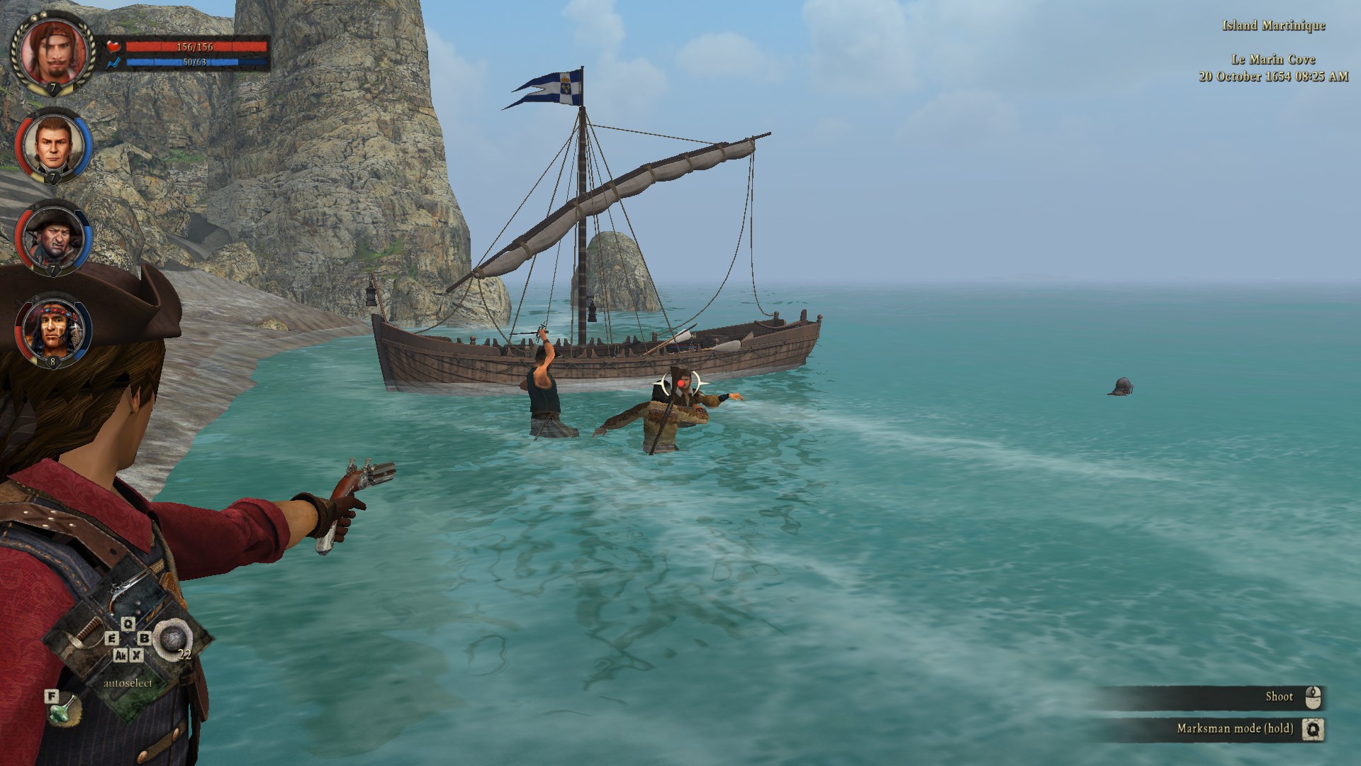 You just draw your pistol and shoot one of them in the fuckinâ dome before combat starts. This made me laugh so goddamn hard, probably because Iâve never had the option to just shoot a guy in a conversation yet. It seems like something Charles could get a lot of mileage out of, honestly. The ensuing battle, even by the standards of this game, is pure slapstick. The remaining thug chose to full on sprint out into the surf and fight my guys in waist deep water. Also pictured is fucking Tommy Irons literally neck deep in water while wearing a heavy ass breastplate and helmet