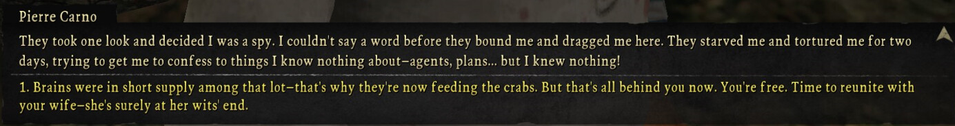 So we take this guy back to town, and the game does something weâve never ever seen before, where every other line of dialogue is from a different characterâs perspective???