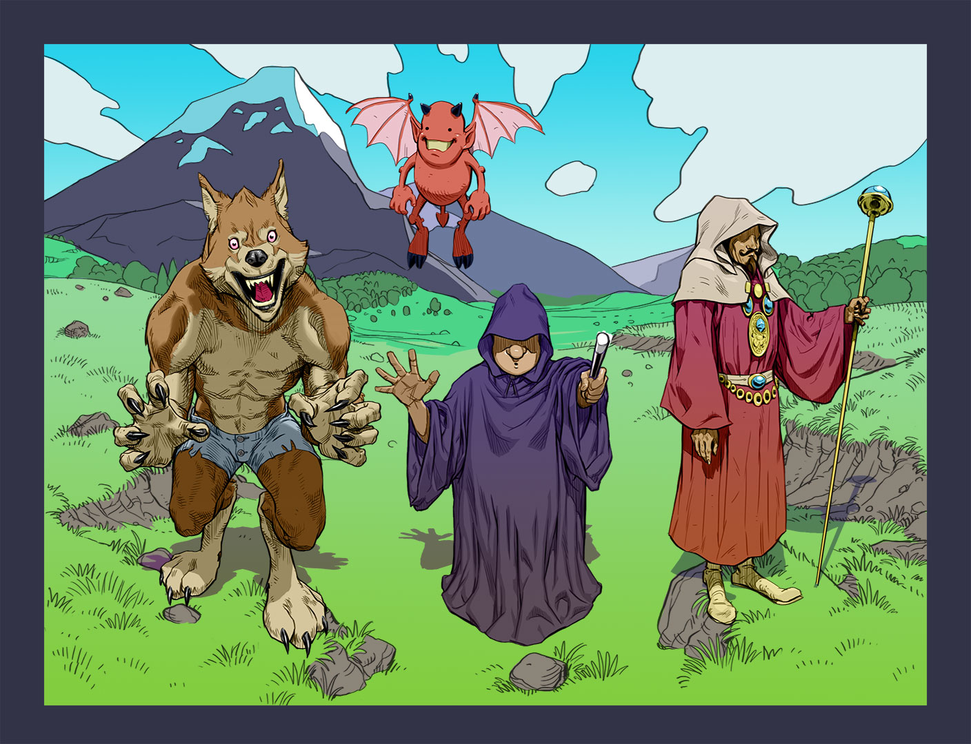 Anyway, I did a bunch of sketches, but so far only 4 made it to a semi-finished state. Two of them are magician types, so you can see what I was doing with higher-level interpretations. I’m about to get busy again, so this is getting shelved, but these were pretty fun, so I’ll probably revisit it eventually. Only one sprite is supposed to appear on this background at a time, by the way – right in the middle. I just packed them in here for efficiency’s sake.