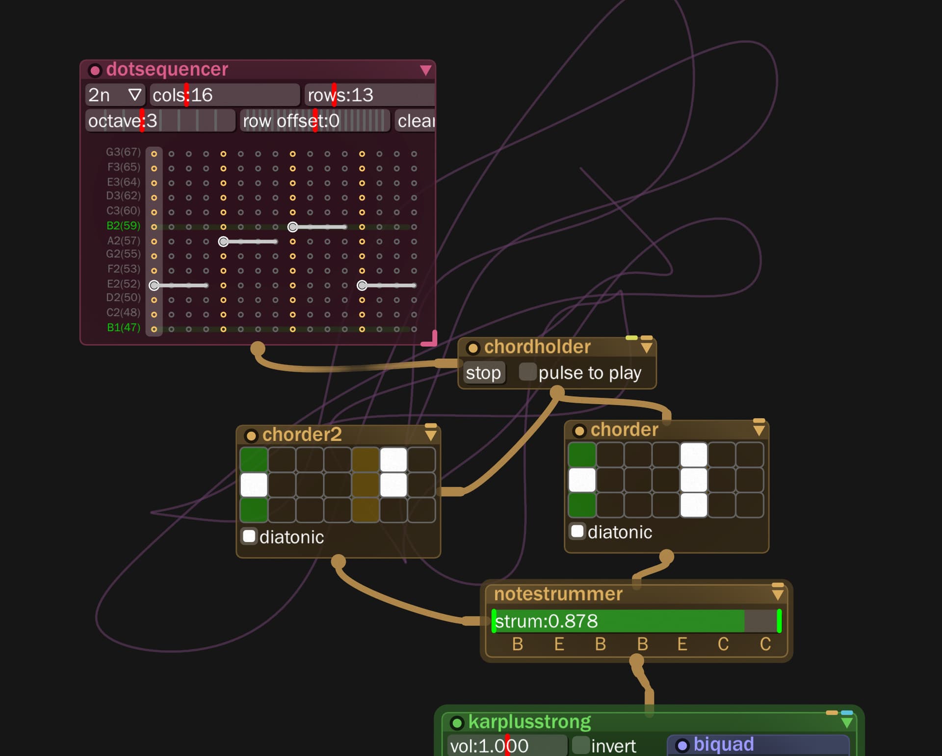 it’s in b locrian, b is the home note, it feels settled in relation to the other notes. i have this dot sequencer hooked up to 2 chorders which feed into a strummer. i was going to have a chain of chorders that switched on and off in order to automate cycling chord progressions rooted in a note that comes in via midi input, but i ended up with two chorders active at the same time because it sounded nice