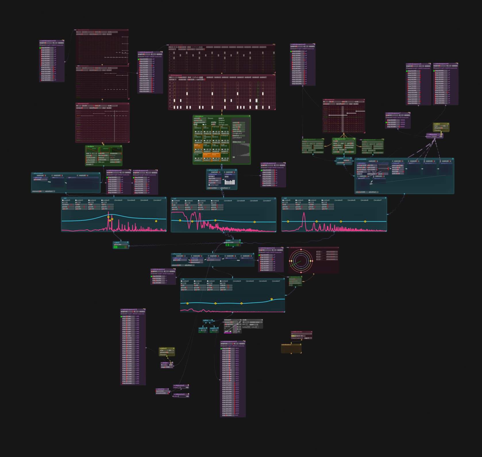 the text isn’t legible when zoomed out and jpg compressed but the mauve things are note patterns, the green things are synths, the blue things are effects, and most of the purple things in this patch send control signals to any component based on timers.