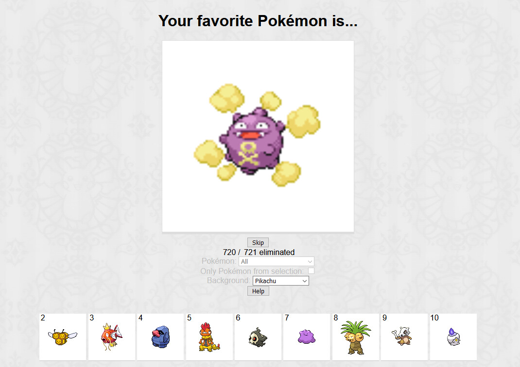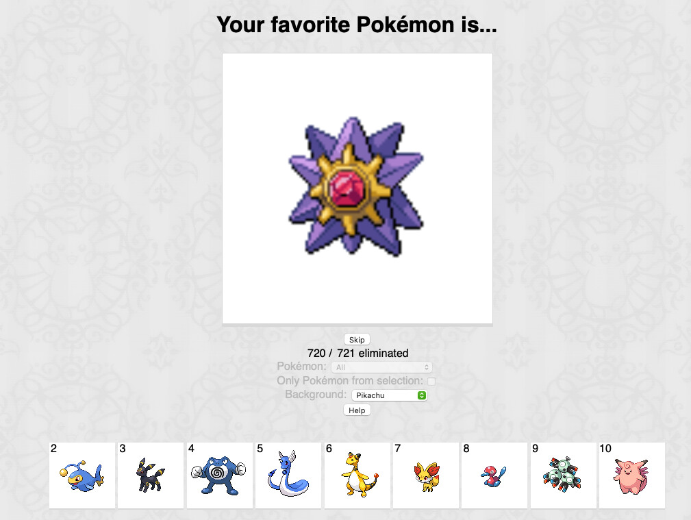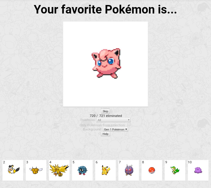 I noticed that the “skip” button made it so neither pokemon got eliminated, though in the end that just made whittling down the top 40 excruciating.