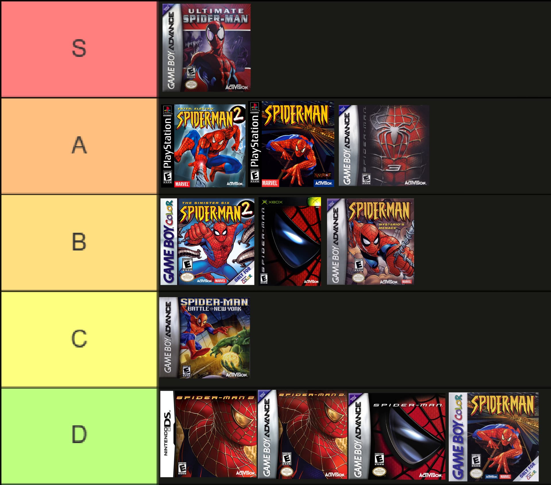 Notably I’ve already started this quest and I’ve been formatting my progress into a tier list. It’s specifically ranking them against each other as Spider-Man games and not necessarily games as a whole. Some stuff may shift around as I go and I might even add more tiers, but most importantly I should quickly catch you up to where I am now so that I can seamlessly add the new entries as I beat them.
