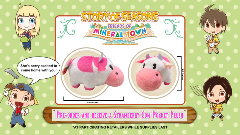 if you pre-order the friends of mineral town remake you’ll get this adorable “strawberry cow” plush, though, the plush cow in general seems to be the go-to pre-order bonus for harvest moon story of seasons games.