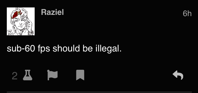 thank you rudie framerate talk makes me crabby because it is a key element in almost all my favorite genres and i’ve seen vastly increased enjoyment and personal performance whenever i’ve gone from a low framerate to a high framerate