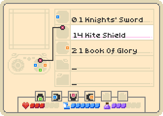 I have a pretty full character list of 16 different characters that can all be customized. They are equipped from a Llist of 11 normal melee weapons, 2 magic weapons, 4 projectiles, 10 shields, 3 magic trinkets, 8 consumeables, and 2 miscellanous items. This seems like a lot of items, but I actually think this is just enough to fully describe the systems I have in place/my interpretation of chaotic melee combat. By that I mean that each character and item feels unique and fills a space in my brainspace that imagines The Moon Fields while also not really overlapping other items.