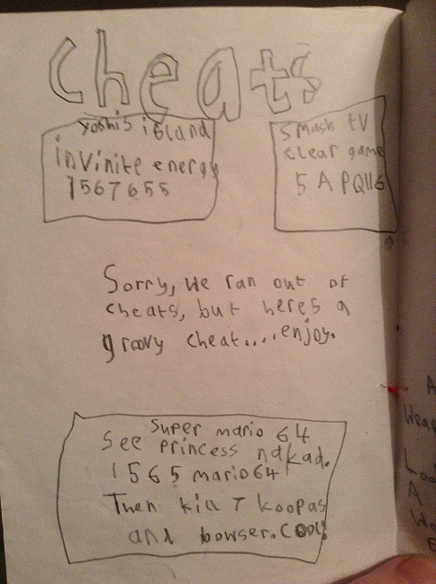 most fascinating to me is the second one which includes a cheat code to “see princess peach nakad”. you will have to take it on trust that i was not very interested in these things at 7 years old, so i’m pretty sure it was just aimless mimicry of the endless tomb raider nude code articles i remember seeing in GamesMaster or whatever at the time, including the weirdly intimate framing