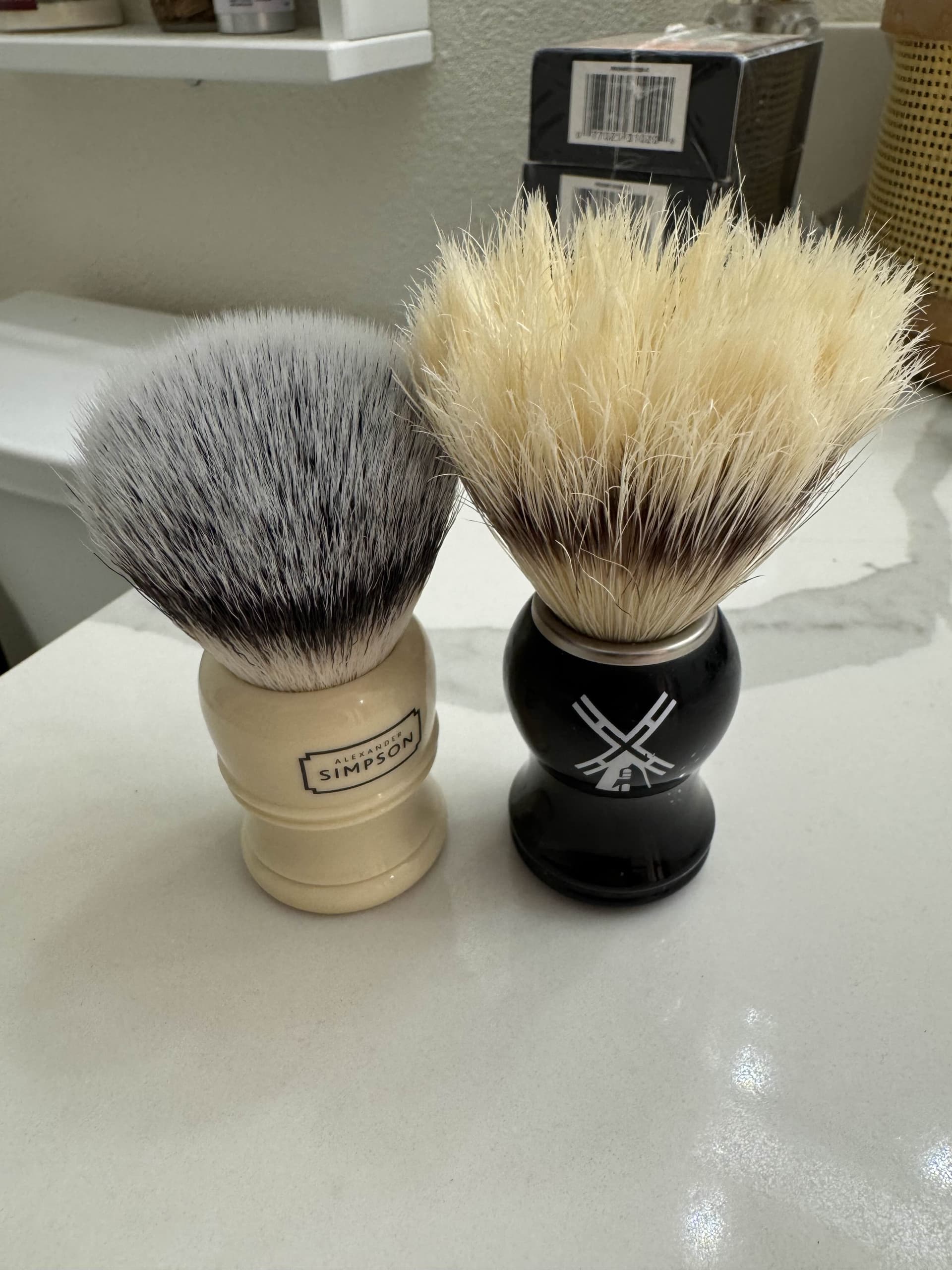 My latest step in this whole experience has been in upgrading the boar brush that I got with my first shaving soap to a synthetic one from an English brand called Simpson. The relatively inexpensive boar brush I had just totally fell apart. I made the erroneous assumption that using a natural hair brush would somehow be sturdier or better, when I guess what I am trying to do with this whole shaving experience of mine is make things inexpensive, long lasting, and quality. I didn’t like having huge chunks of boar hair fall out of my brush or finding strands of it in my razor and around my face very much. This new brush just arrived today, so I can’t sing its praises quite yet.