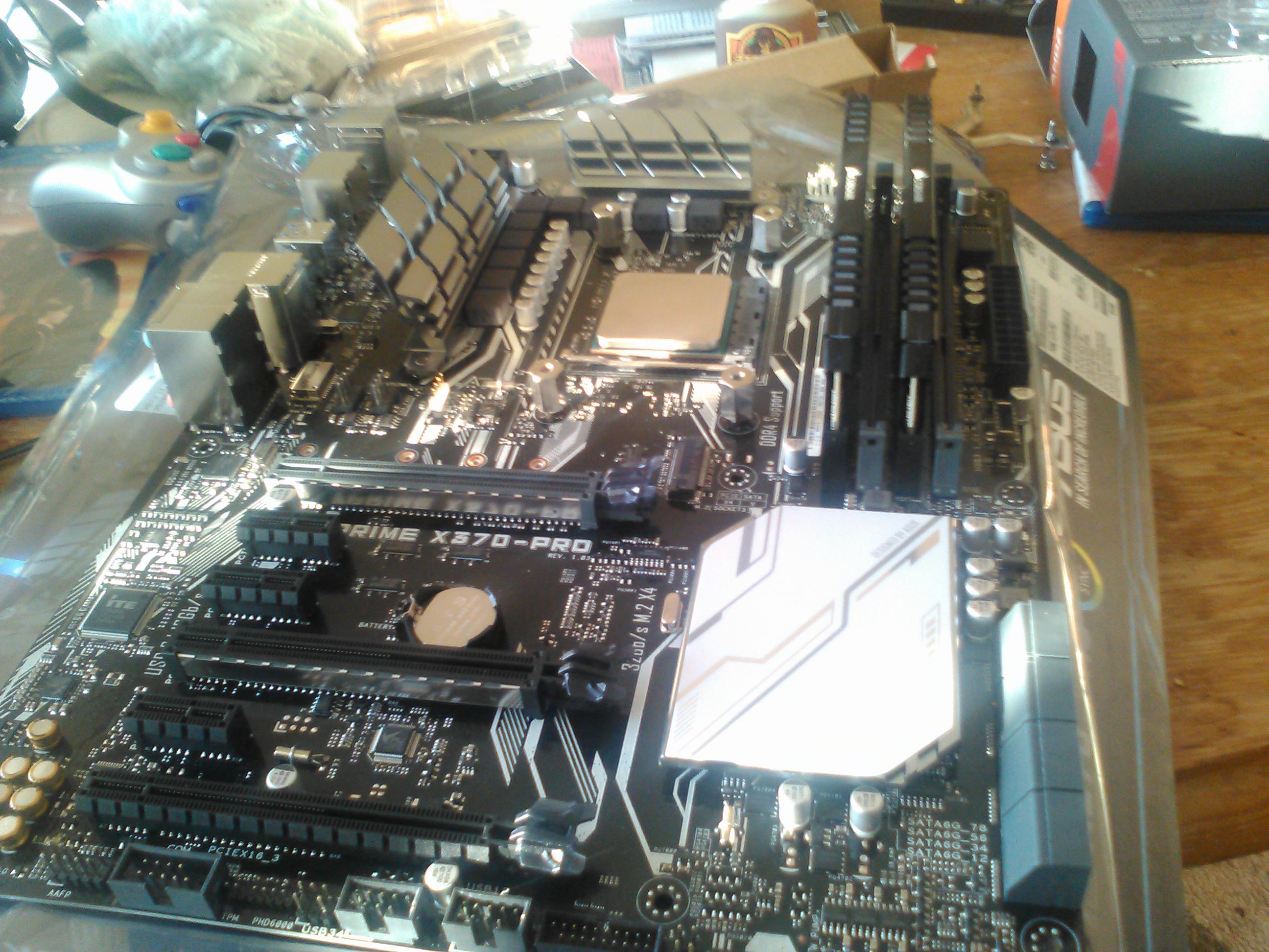 with great wrenching effort I’m able to replace two of the three of them on the mobo itself because they come with fasteners to do this; I don’t have anywhere to put the third one so I just poke a hole in the I/O backplate and glue it on where it sort of fits.