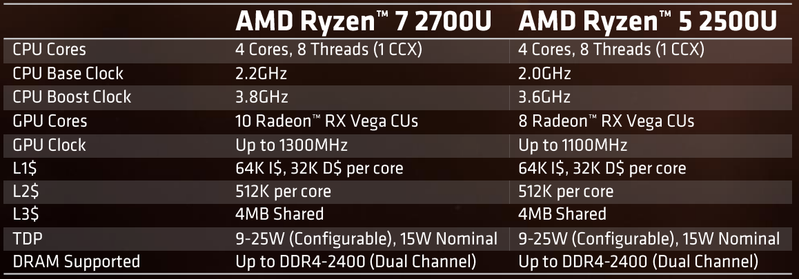 These are the specs for AMD’s first Ryzen CPU/Vega GPU based laptop APUs, which are in actual products, right now.