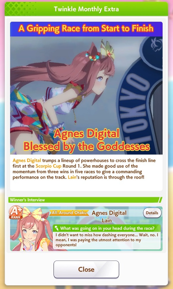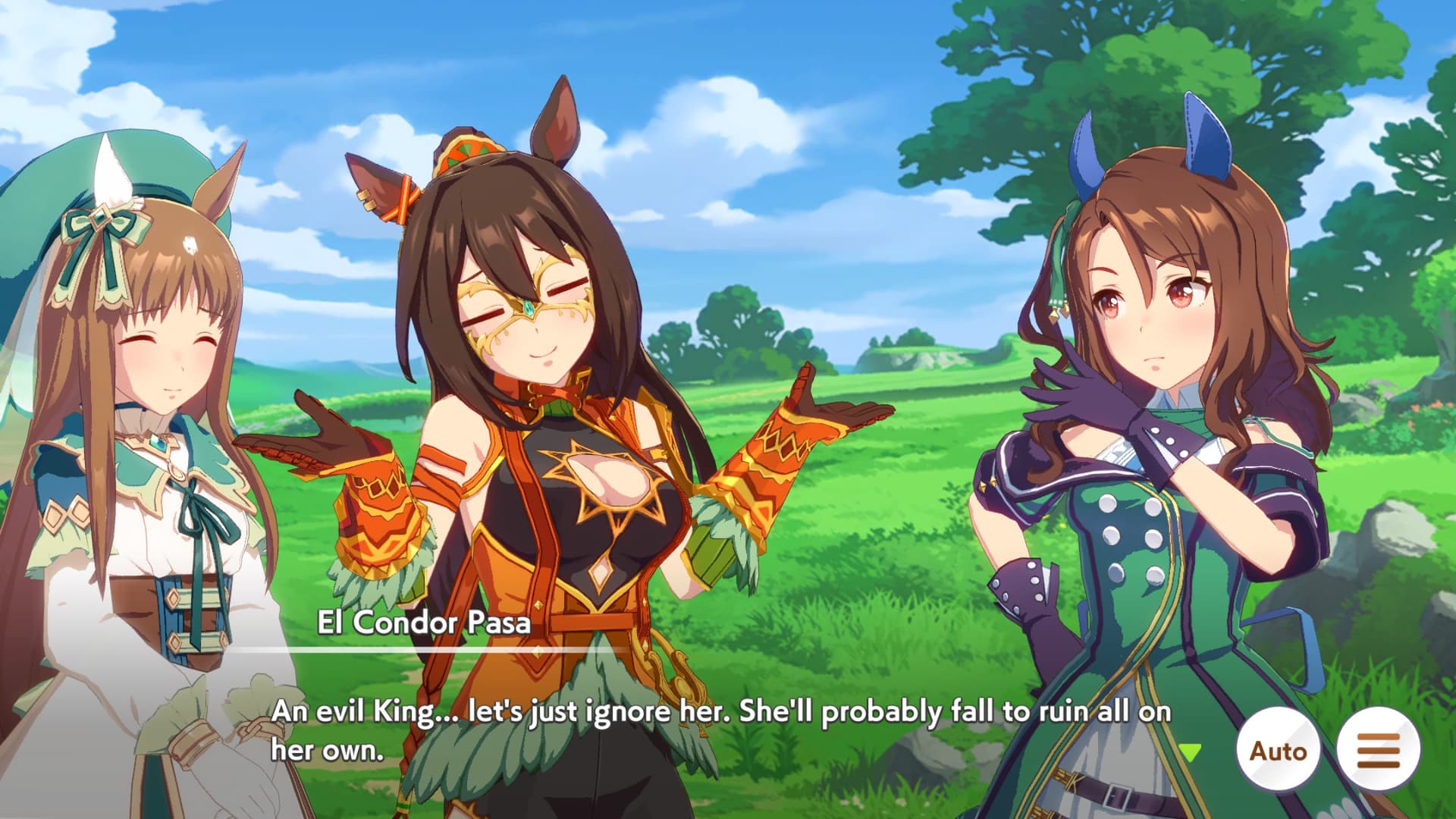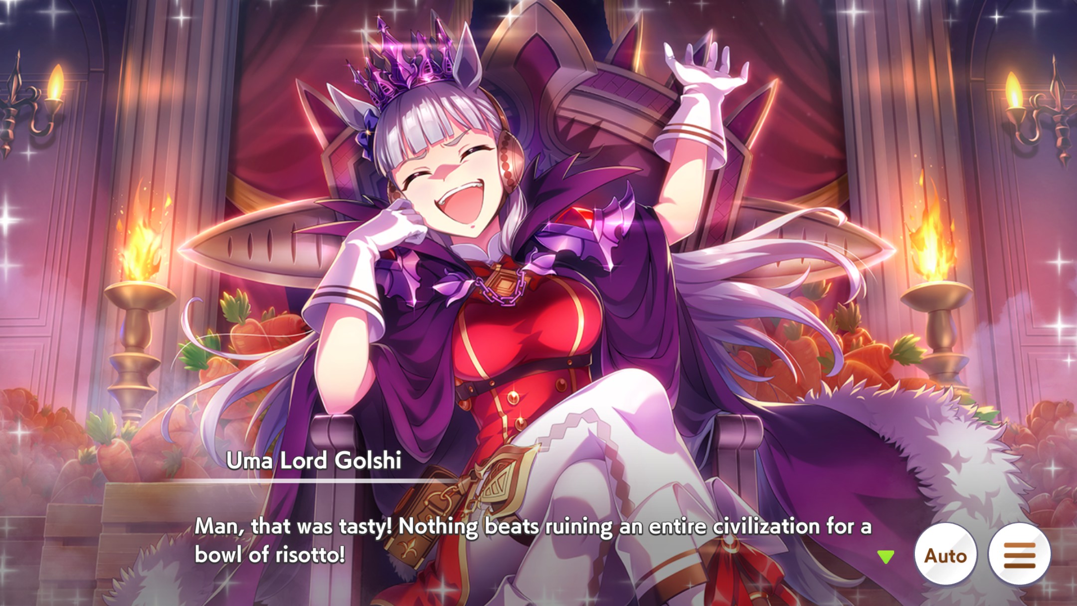 Frustratingly it’s kind of working. I just picked 3 horses with enough stam and S Medium aptitudes, and let the goddesses take the wheel. That didn’t work, so I trained a Symboli Rudolf specifically to tell terrible jokes to front and pace runners, and that cleared the lane for my horse to cruise to a moist victory. I’m still losing to the american horse though (because she has a gun).