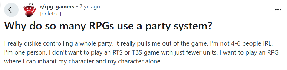 Yes, I don’t like control too many (more than 3) people in an old Role-playing videogame either, feels like a Solo DnD.