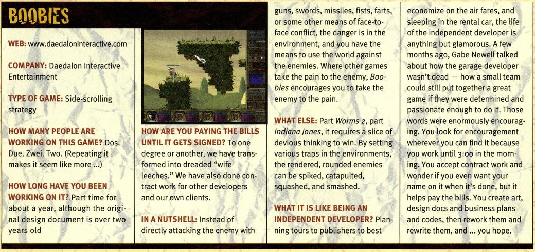 via a random wikipedia wormhole i found some article covering the indie game development scene in 1999 and the very first IGF in the short-lived Maxim-style edgelord pc gaming magazine PC Accelerator.