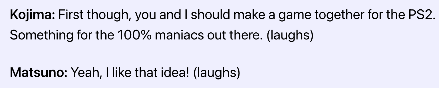 trying to imagine what a kojima matsuno collab would be like aside from comically overbudget and all i can settle on is that matsuno would give every character a sister and kojima would be weirdly performatively horny about it