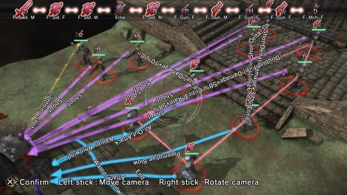 The other system at play is the “link” system. When multiple allies are occupying the same or distant squares and attacking enemies in the same formation, they get a “link” bonus based on how they’re positioned relative to the rest of the squad. You can set up a guy all the way at the back of your square, for instance, to attack an enemy soldier all the way at the back of yours. Put another dude or lady up front and they get a silver stream of light connecting them that increases their damage and hit %.