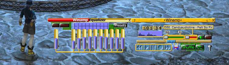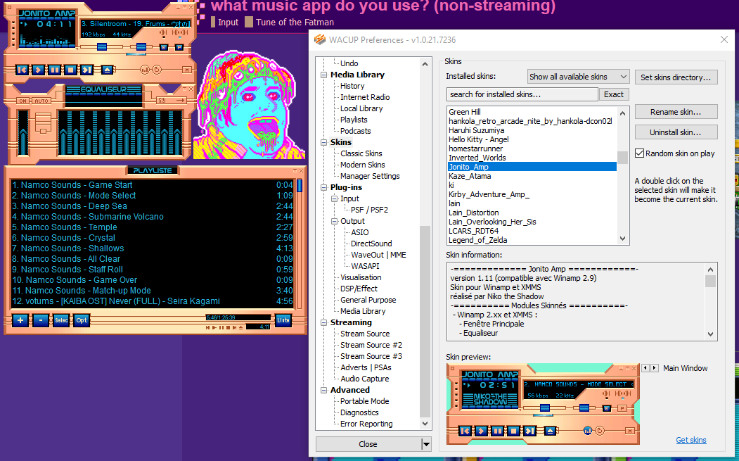 yeah i use wacup too cuz real winamp is terrible hahah WOO RANDOM SKIN ON PLAY IS CHECKED excited to not have to manually switch them all the time yayay