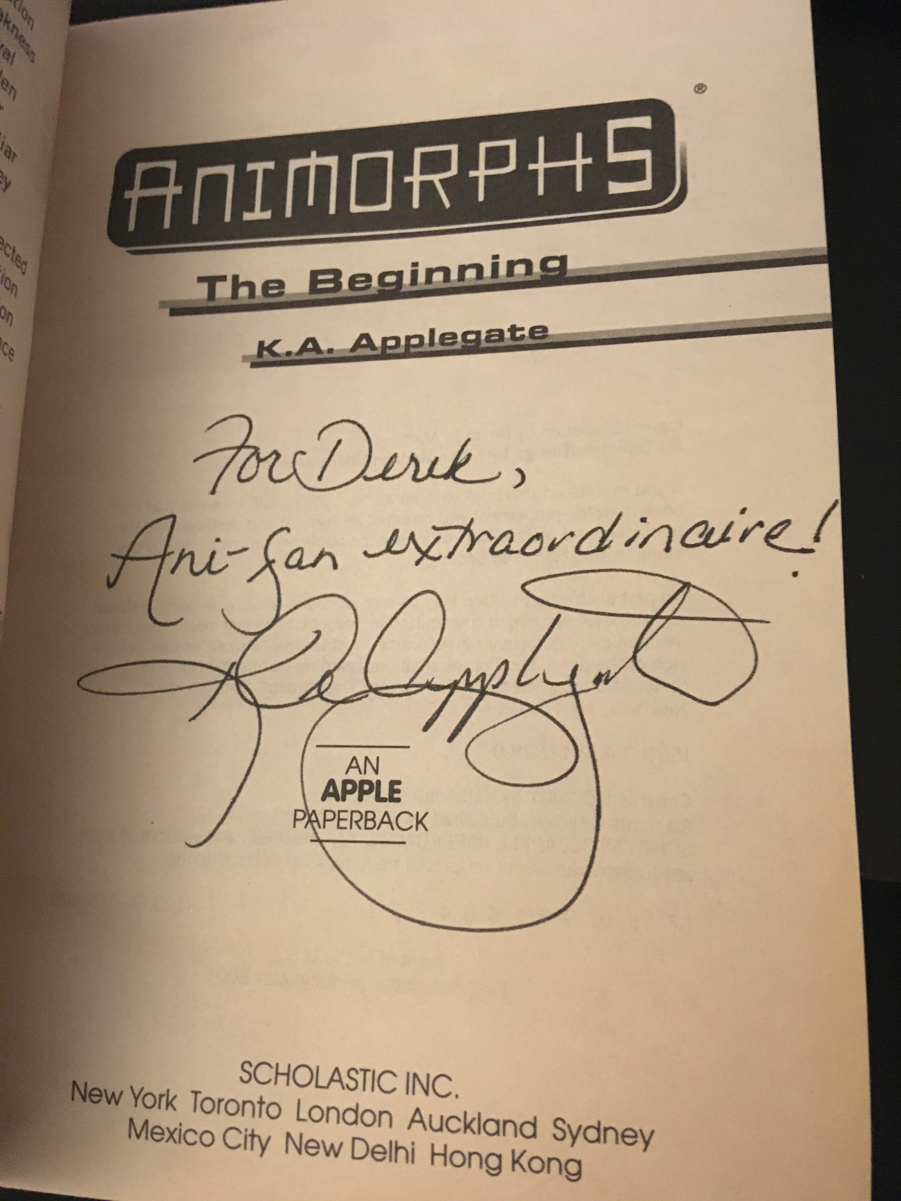 Also, my girlfriend got me the best birthday present this year. She used to work at a book store in Tiburon, CA that K.A. Applegate occasionally visits. She borrowed my copy of the final Animorphs book from when I was a kid and left it with a coworker there, who got Applegate to sign it for me on one of her visits.