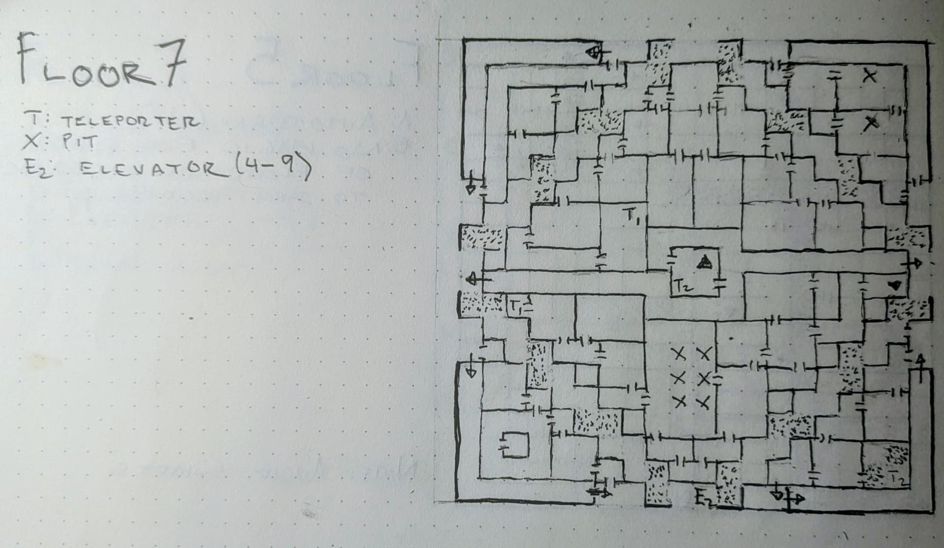 I want you to note that room in the middle with all the Xs, which are the dreaded pits. When I got to it, I could only see 5 of the pits (or what looked like them, you learn not to take chances), and so when I looped around to the other side, I thought "wait, maybe they were guarding something and this door will lead me to what the pits were surrounding. Whelp, they were surrounding another pit, and half my party wiped. And then we got sent to Hell.