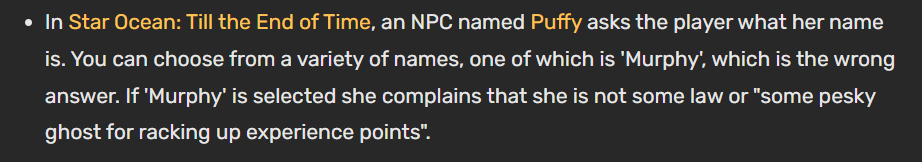 Murphyâs Ghost is an enemy in a sorta strange spot on the first floor who, for that area of the game, is worth a ridiculous amount of XP, and you can just keep summoning him at the shrine over and over again. I think I read somewhere that he is a spirit who collaborated with the Mad Overlord but fucked up, and so was doomed in his afterlife to just keep getting murdered endlessly. Or maybe I made that story up for him. Either way, heâs super useful, and there is a joke in one of the Star Ocean games about him: