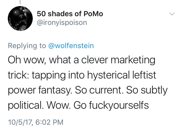“Wolfenstein has been a decidedly anti-Nazi series since the first release more than 20 years ago. We aren’t going to shy away from what the game is about. We don’t feel it’s a reach for us to say Nazis are bad and un-American, and we’re not worried about being on the right side of history here.”