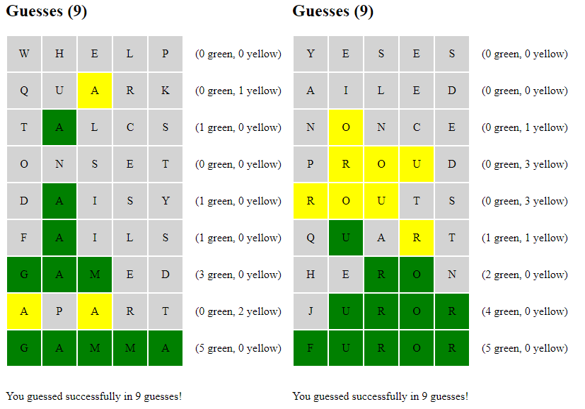 I can get a correct guess within 5 but no faster than that so far with this adversarial version (It changes which word youβre guessing based on which words youβve input so far)
