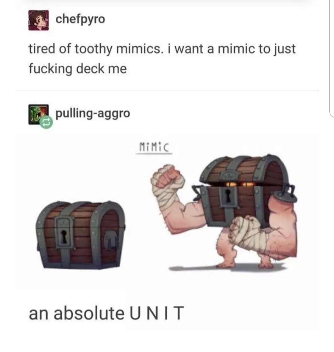 In gameplay terms, she’ll be a swashbucker class and a shifter race. Her “true form” is of course a treasure chest. I’m working with the DM to see if I can get some kind of attack where I assume the form of a chest, sit there, and when a greedy enemy opens me up to get the treasure, I get a chomp on em at advantage.