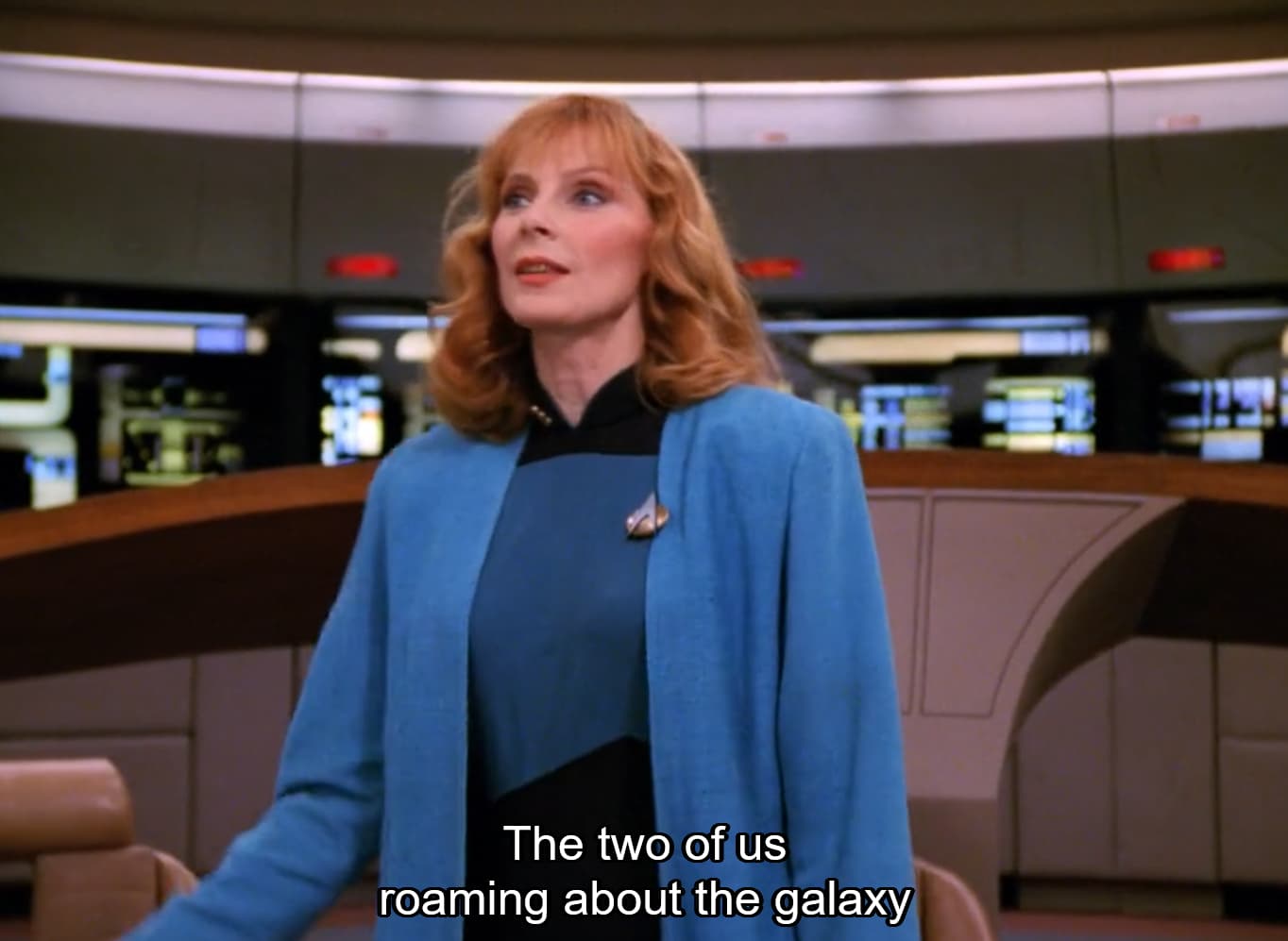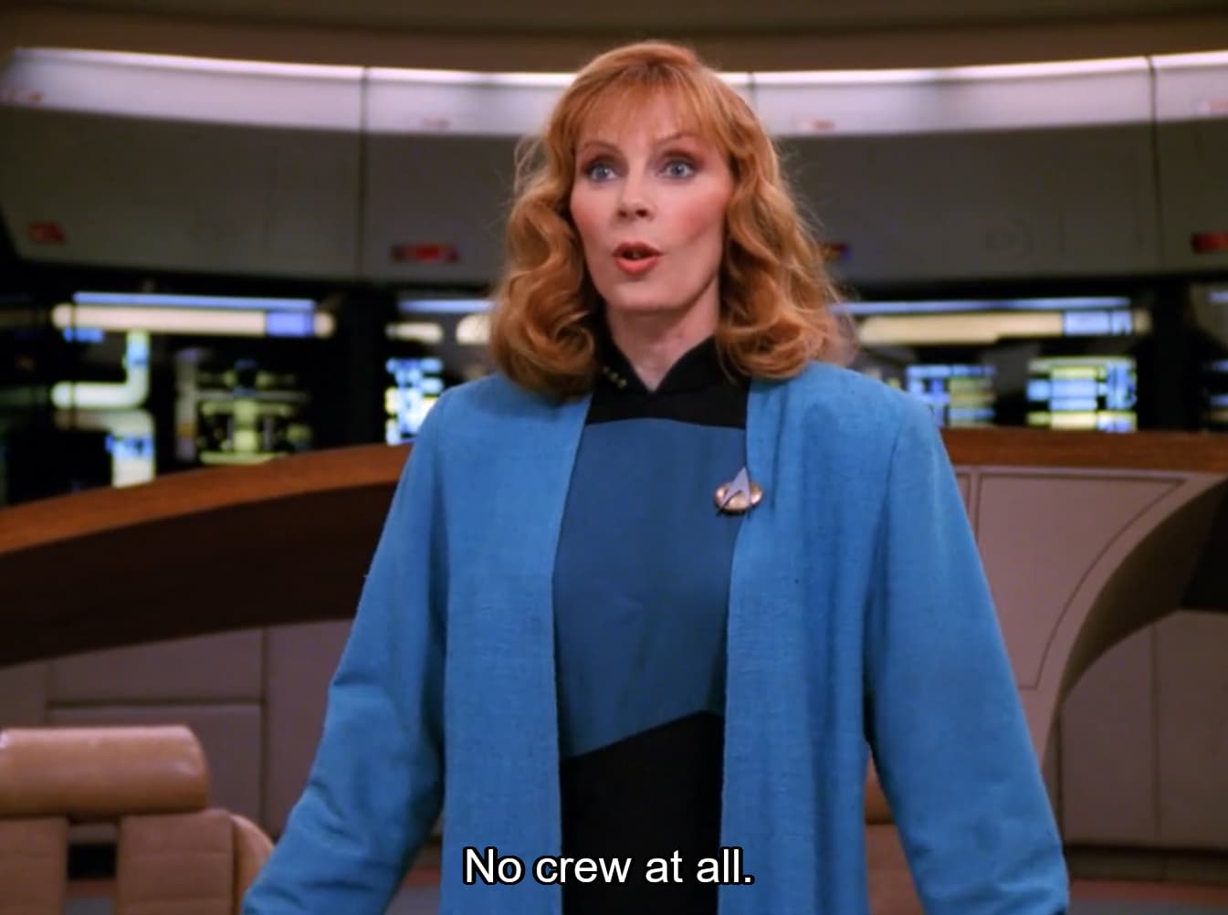 One player in particular did get promoted by the game’s system four sessions ago, meaning that she now is a Commander, right below the Captain of the ship, and complains nonstop about how she doesn’t like having to do things. Why the desire to rank up yet more??? Did you all not see the heavy burdens of command?? Did none of you recall the B plot in Thine Own Self exploring this very concept???