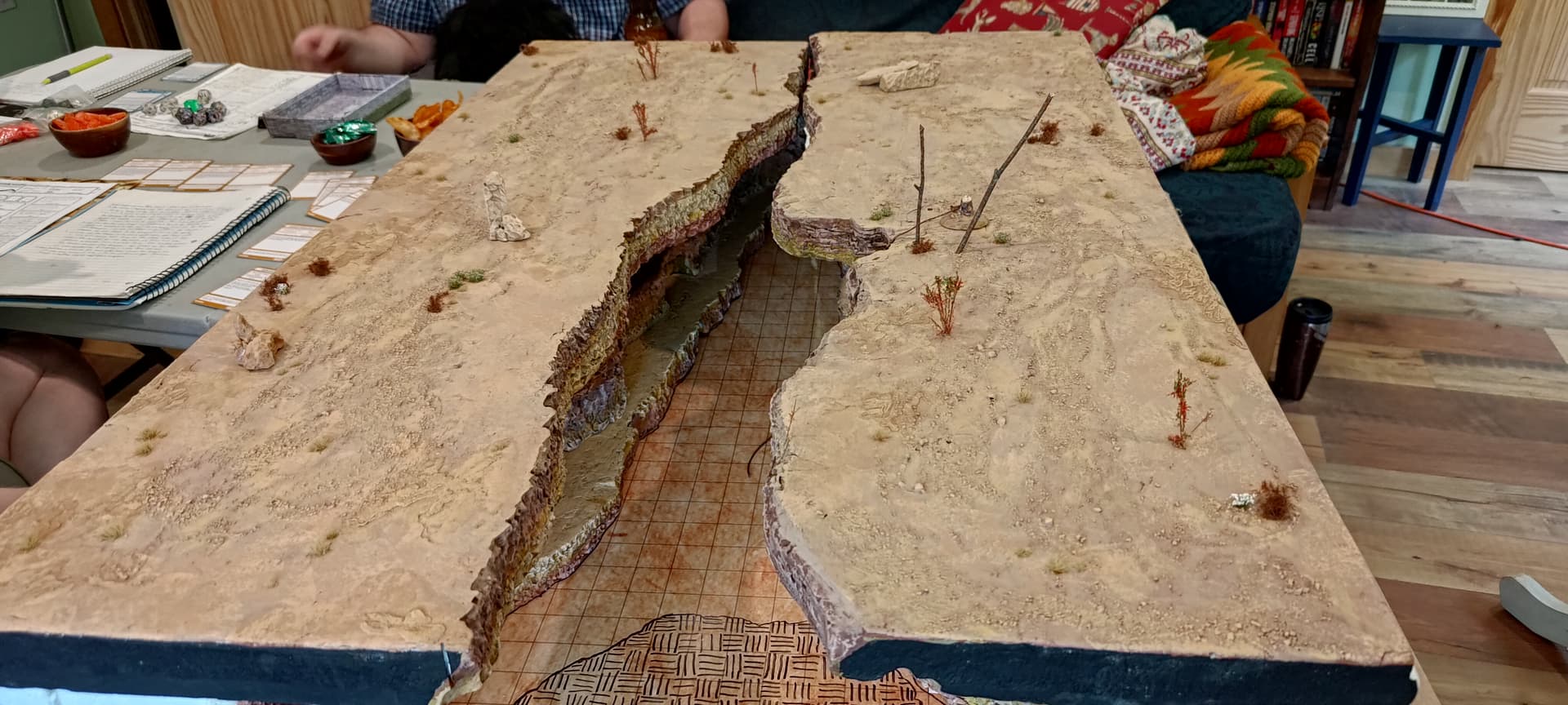 The YHC knows that the Red Hand bandit headquarters is a place called Nimrod’s Well, deep in the badlands of the Devil’s Cheek, and they know approxmiately where it is, though they have no specific info about its exact location or configuration. They also know that the Greenbriar jobber peasants who were playing at being big bad Red Hands, led by Curtis Crings, have a small camp on the South Bend River at the northern edge of the badlands, and that Jala the forester agreed to take the PCs there on the condition that they don’t kill any of them.